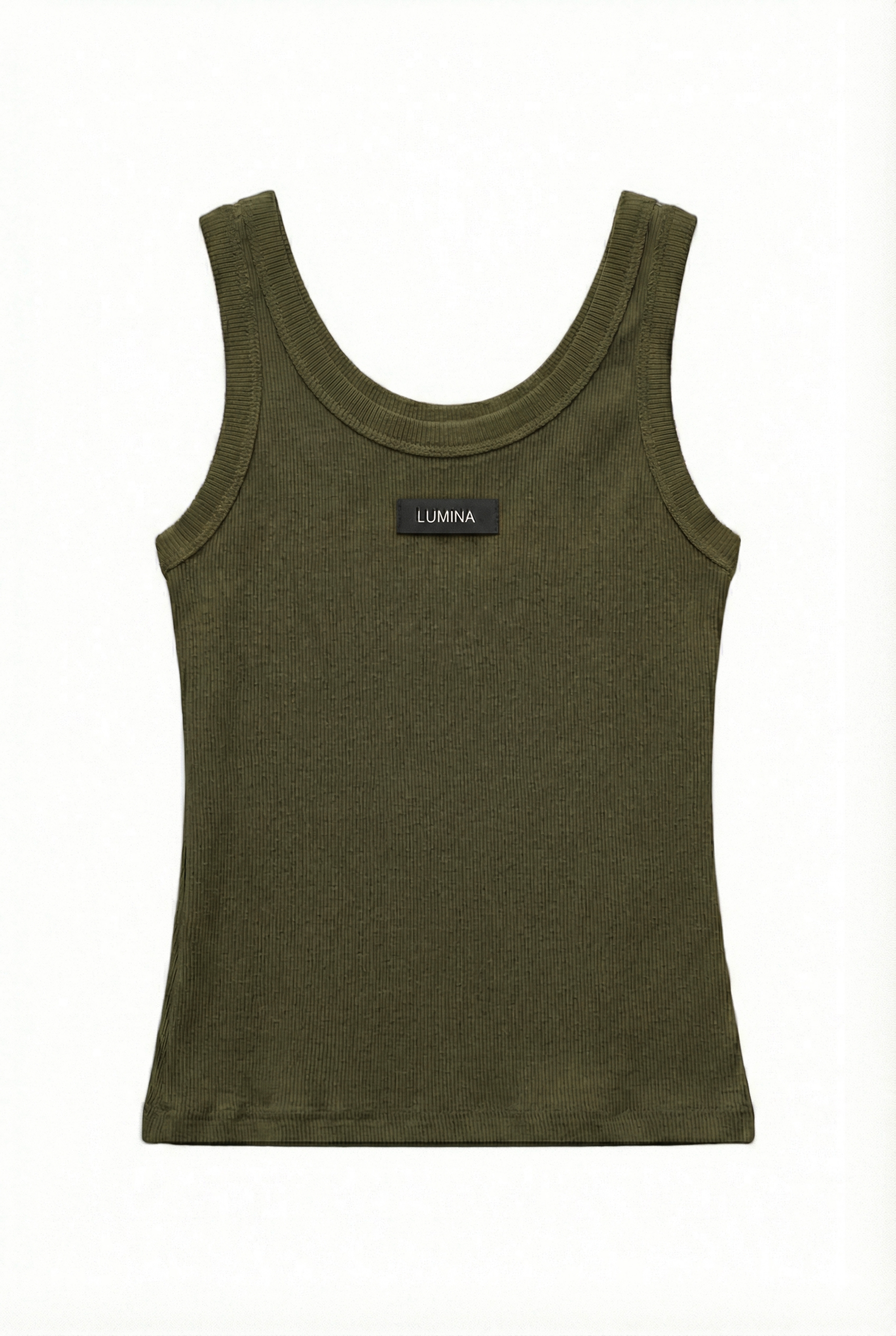 Ribbed crop tank top with wide rounded neckline.