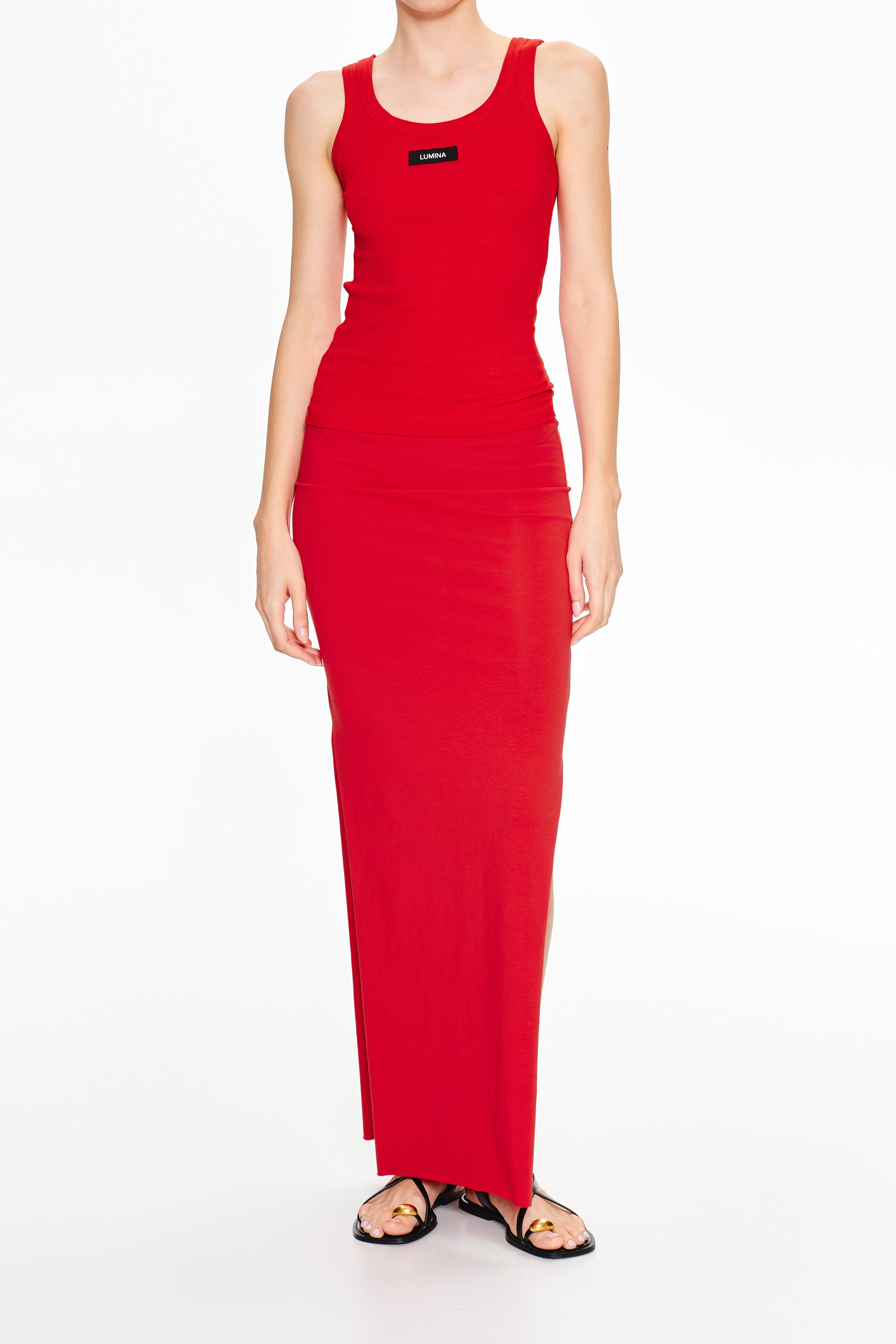 Stretch cotton jersey tank top. Wide crew neckline with a finished finish. Broad shoulders. Front insert with long fringes. Regular fit, available in size S/M, M/L.