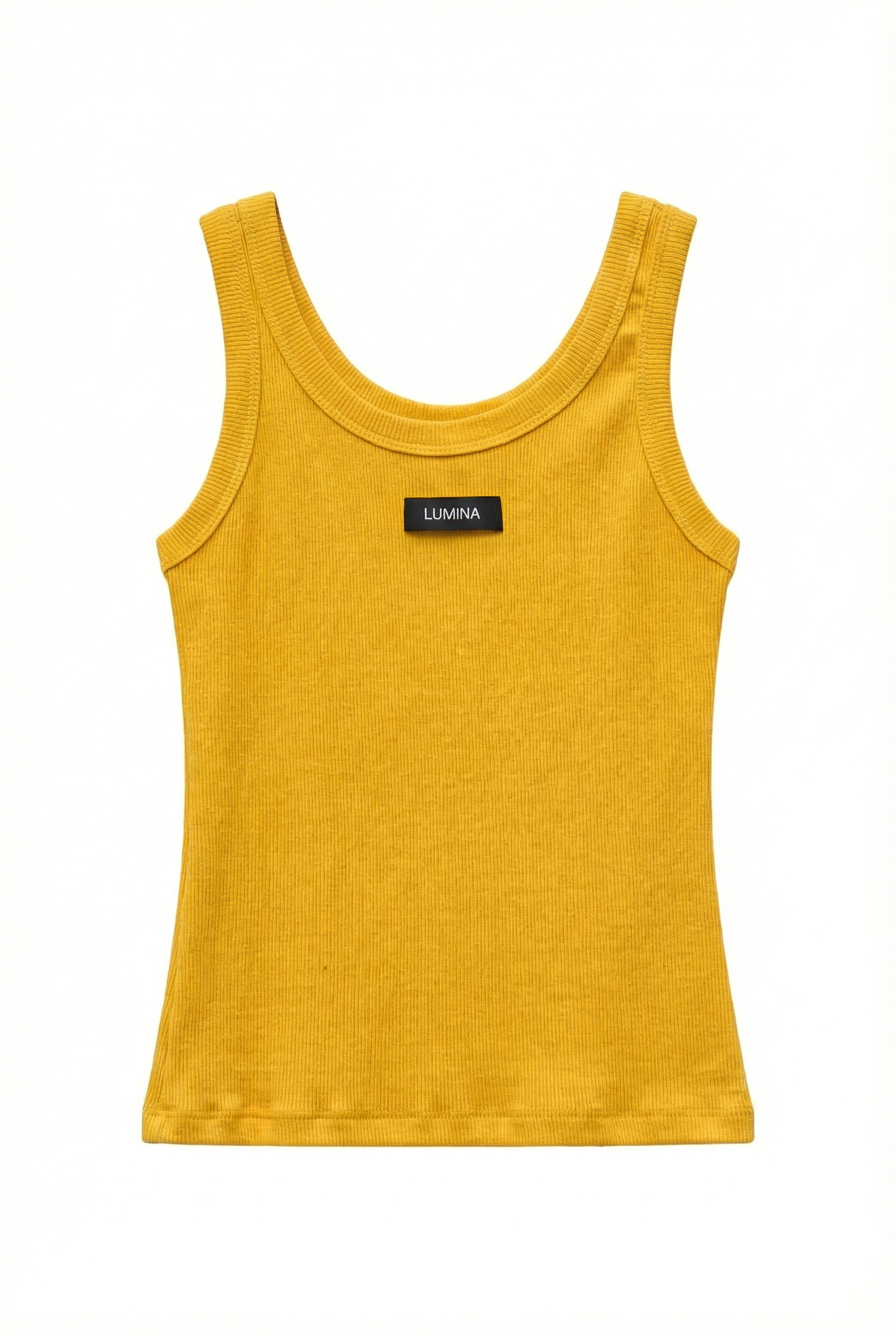 Ribbed crop tank top with wide rounded neckline.