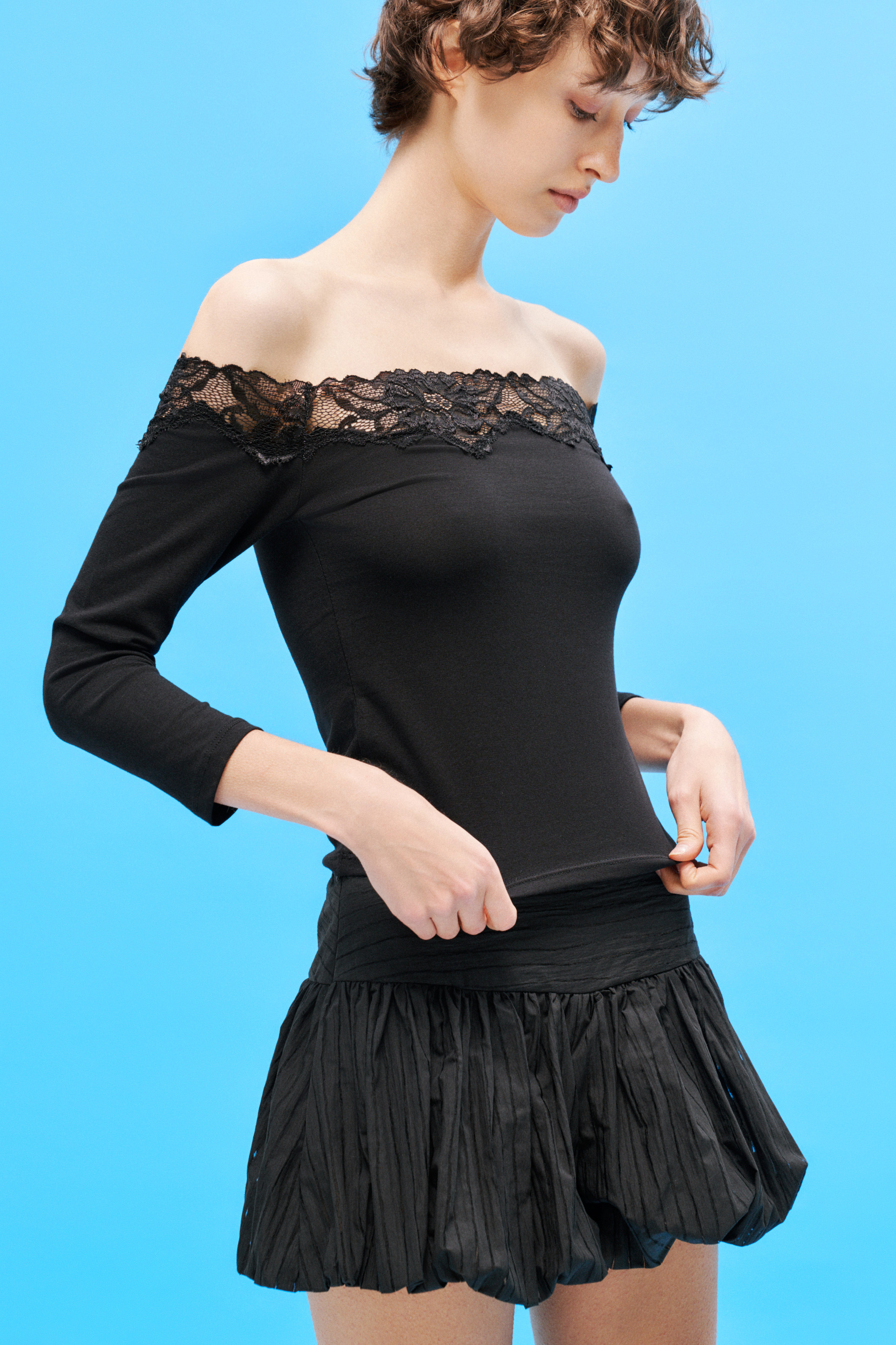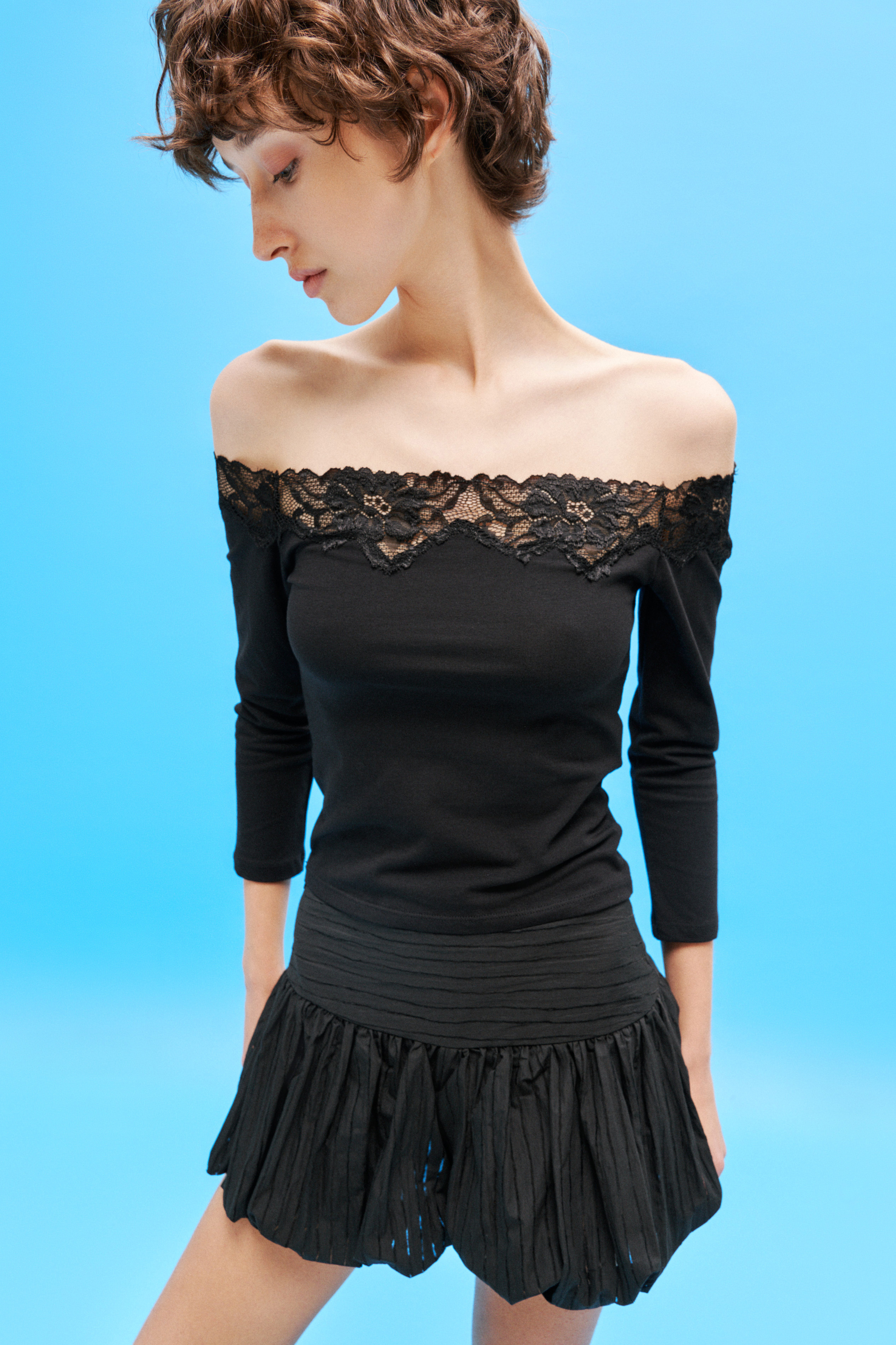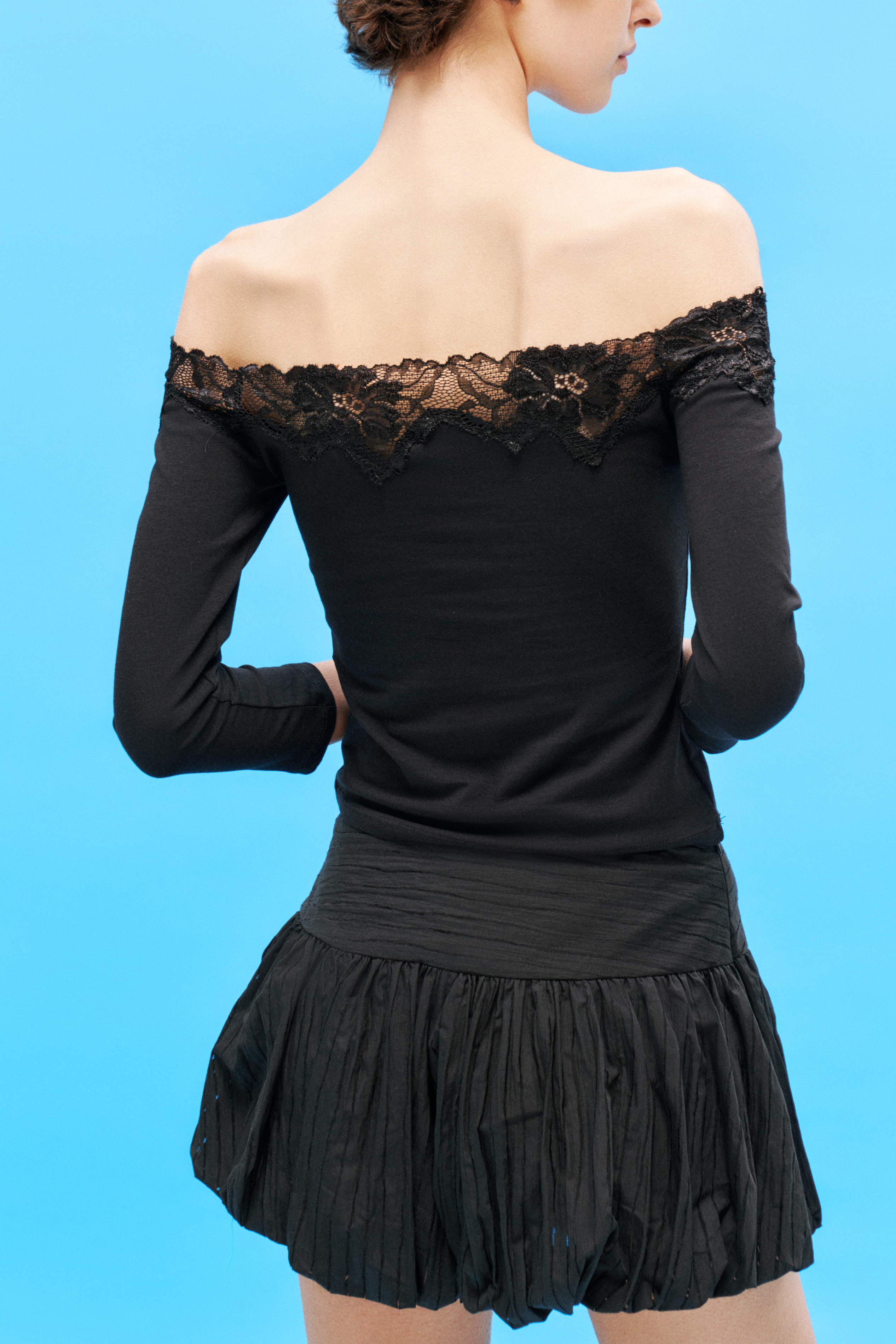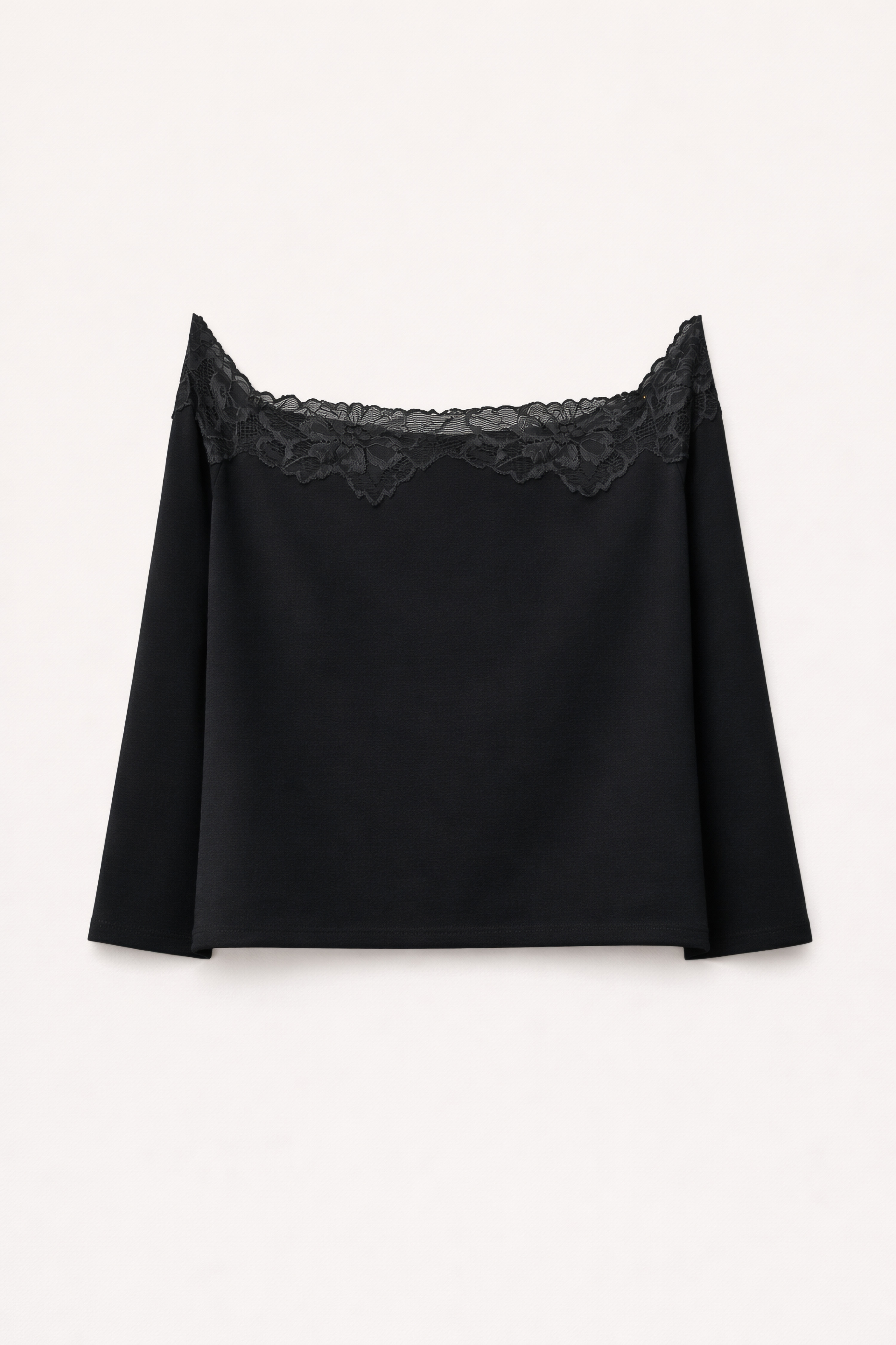 Wide neckline, wide shoulder straps, straight hem finished with lace inserts.