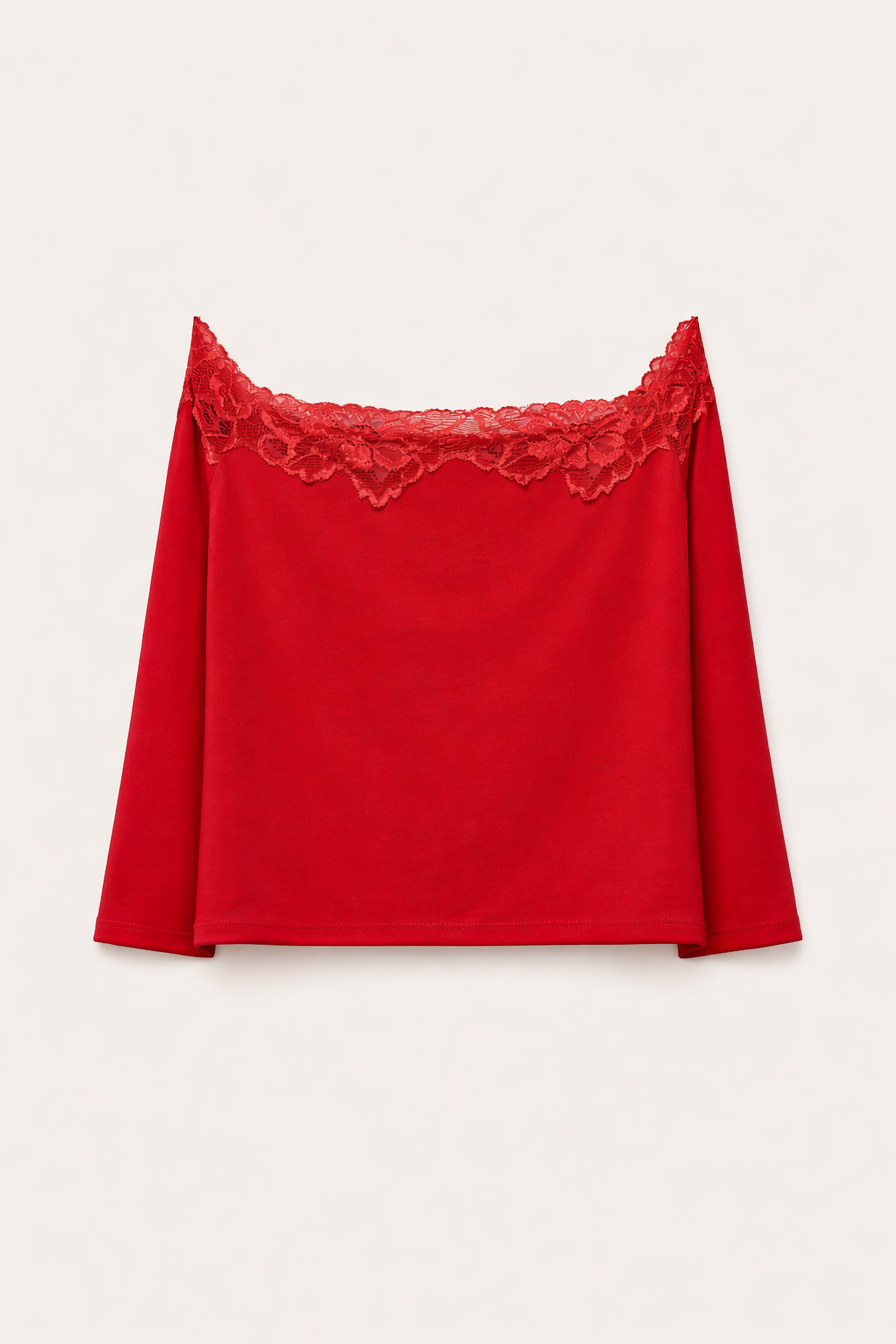Wide neckline, wide shoulder straps, straight hem finished with lace inserts.