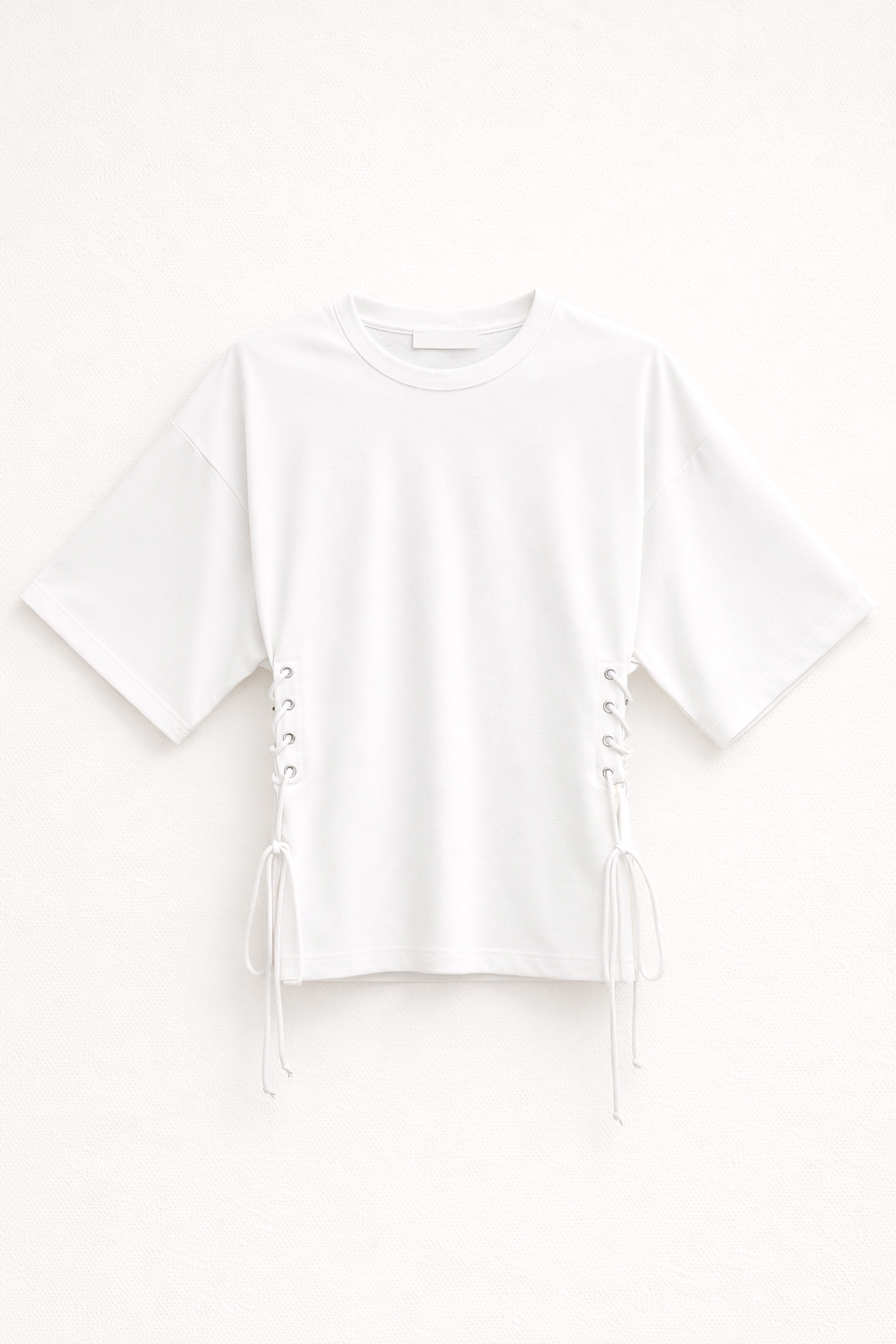 Asymmetrical top in 100% viscose satin fabric. Halter neckline with button closure at the back. Tone-on-tone lace insert along the bottom. Regular fit, available in size S/M, M/L.