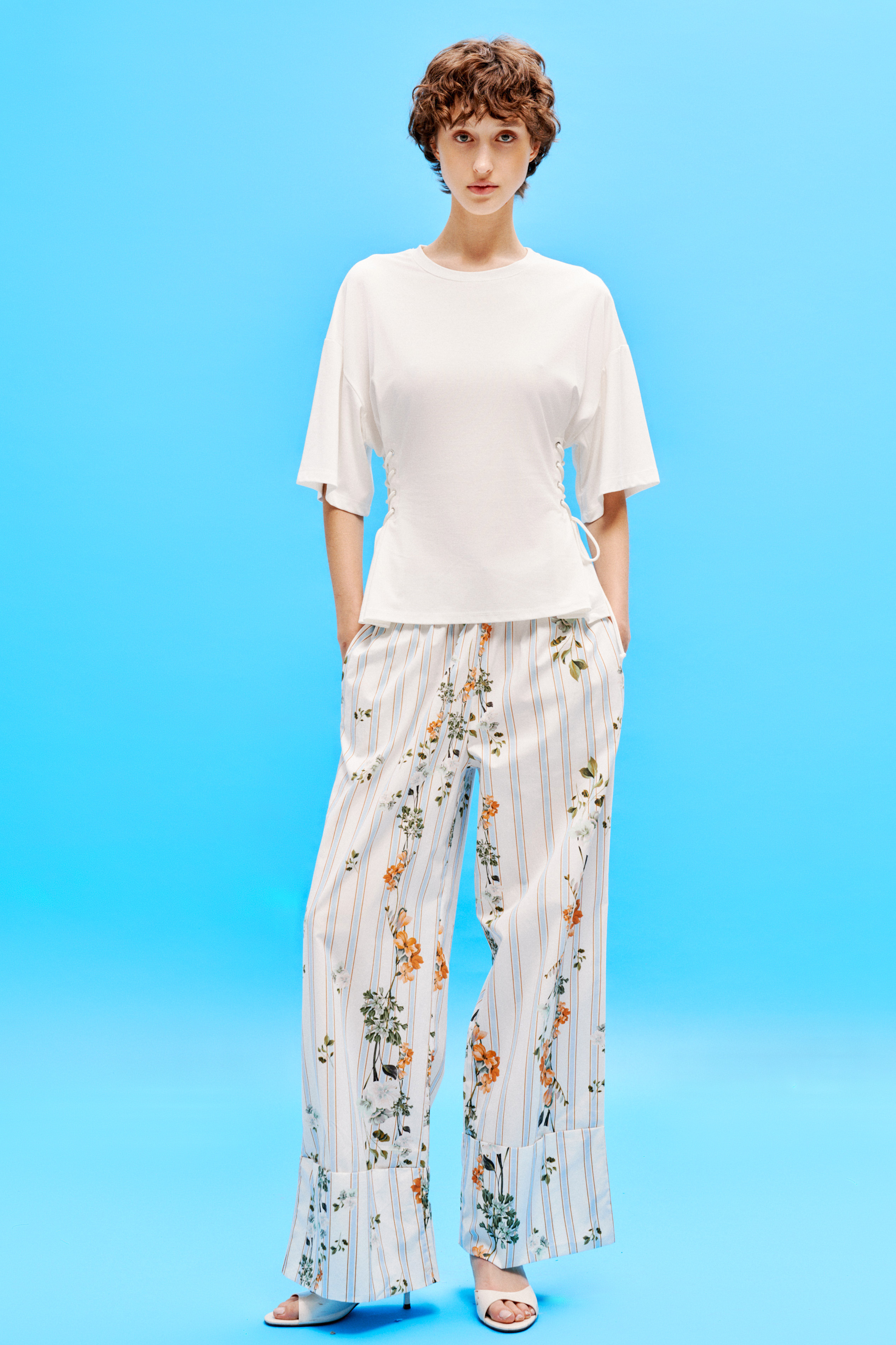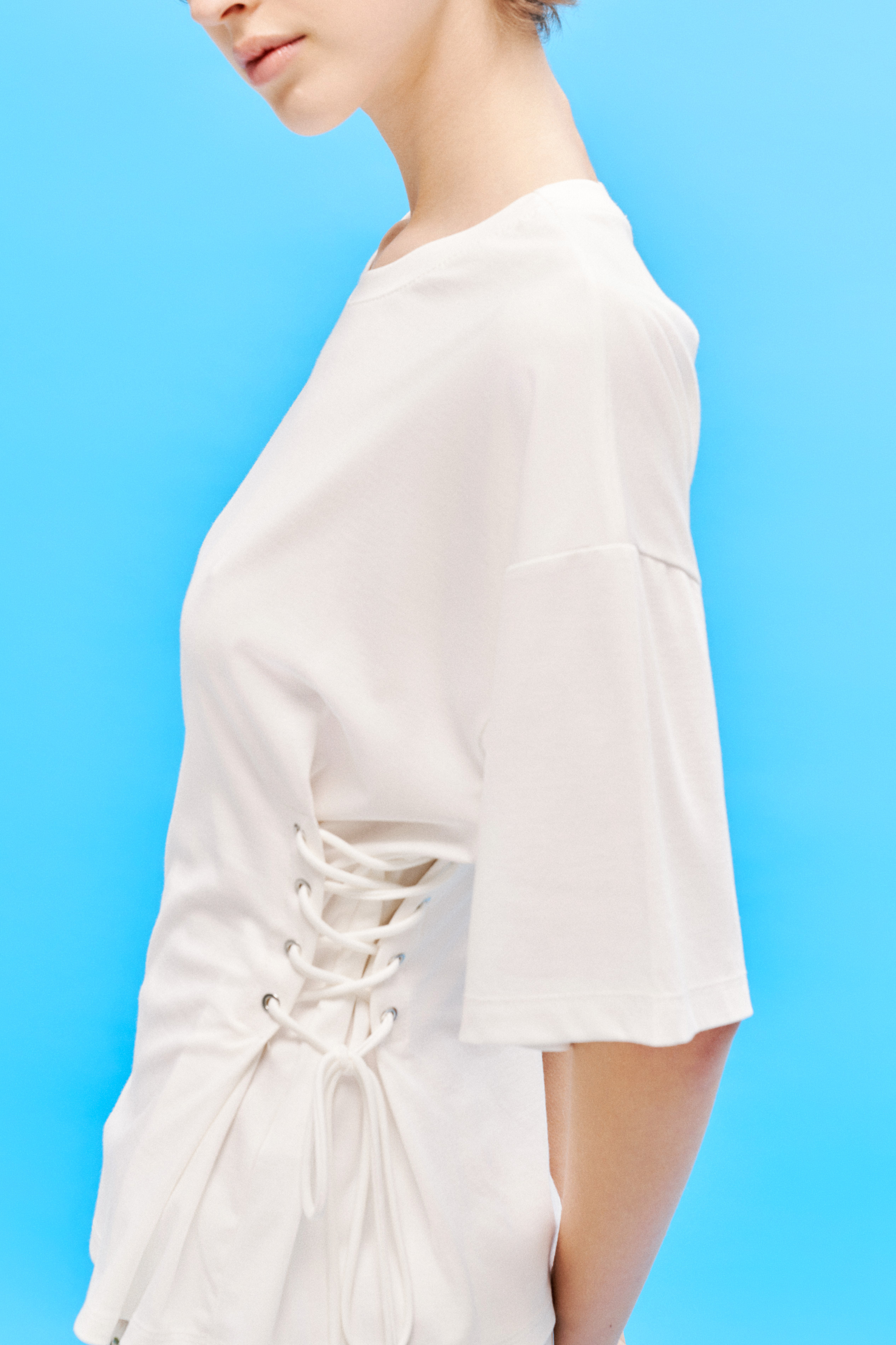 Stretch cotton zebra print top. Round neckline at the front. Short sleeves. Back with open back and adjustable knots. Regular fit, available in size S/M, M/L.