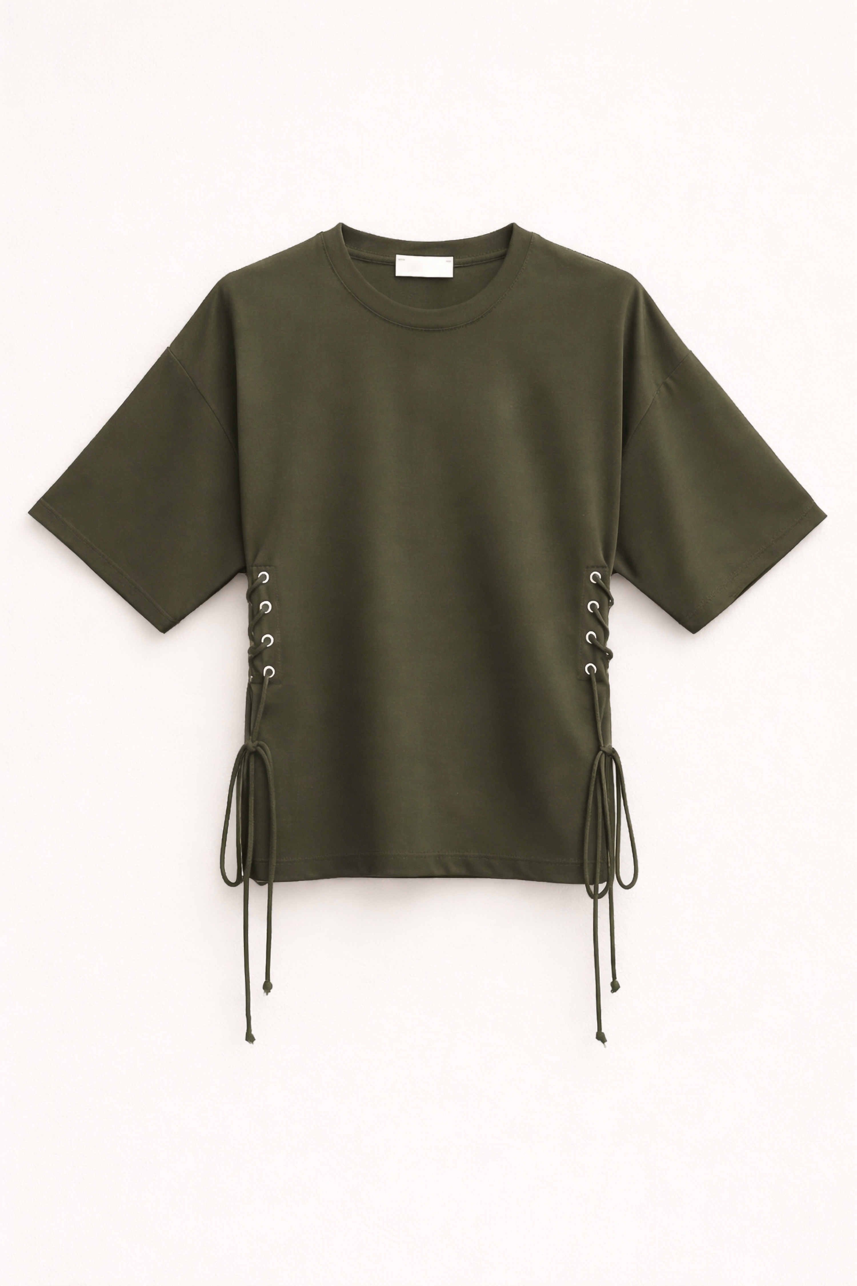 Front button closure with lace inserts on the sides.