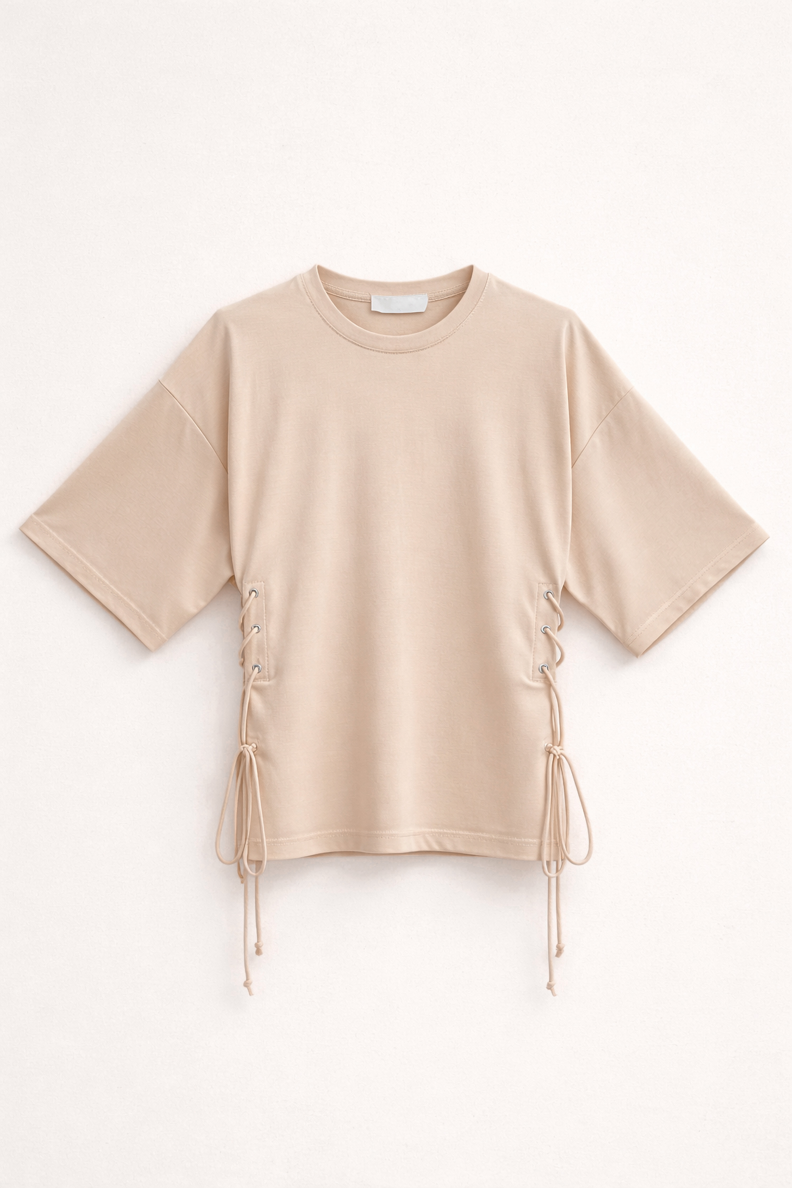Wide neckline, wide shoulder straps, straight hem finished with lace inserts.