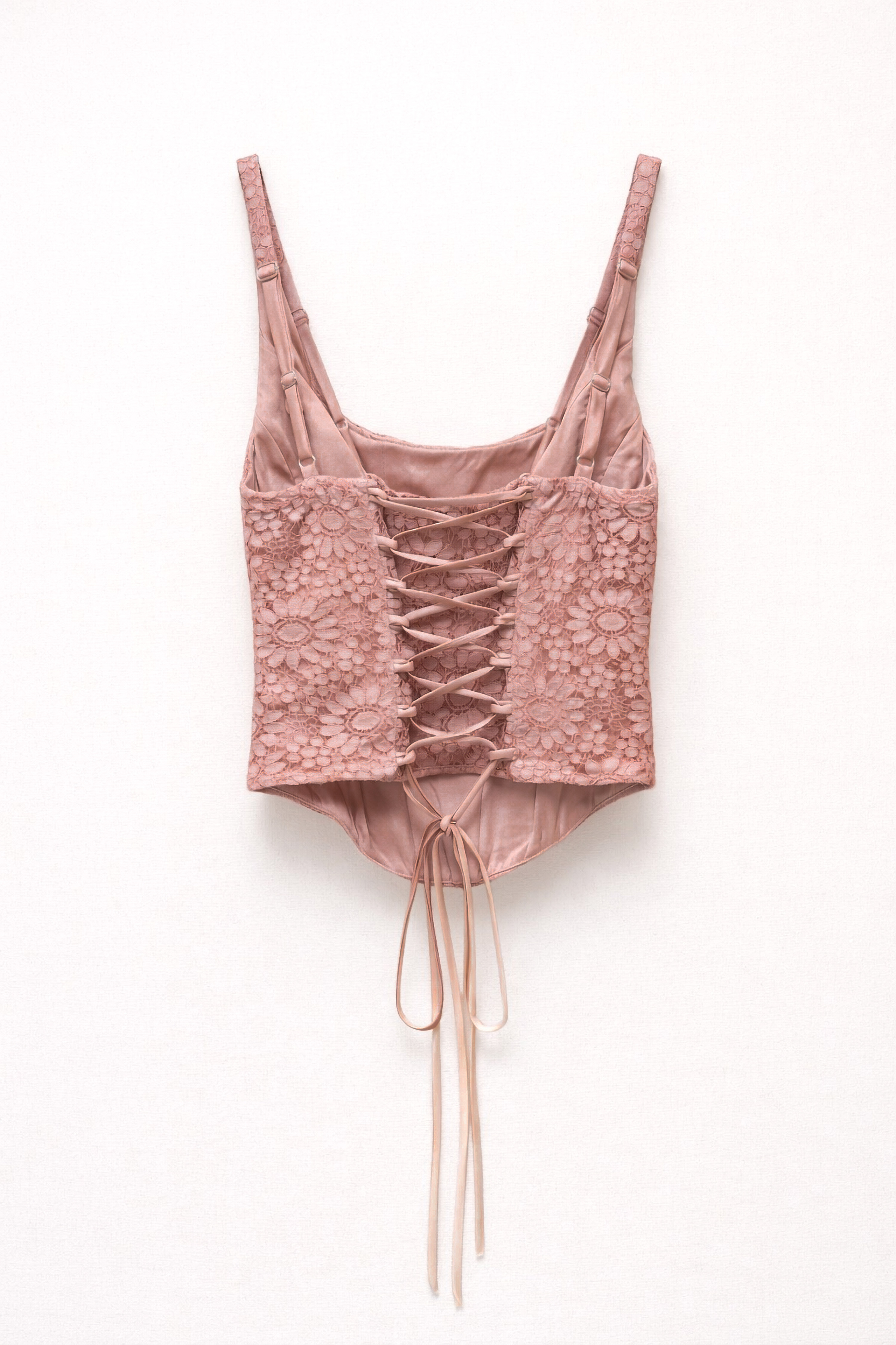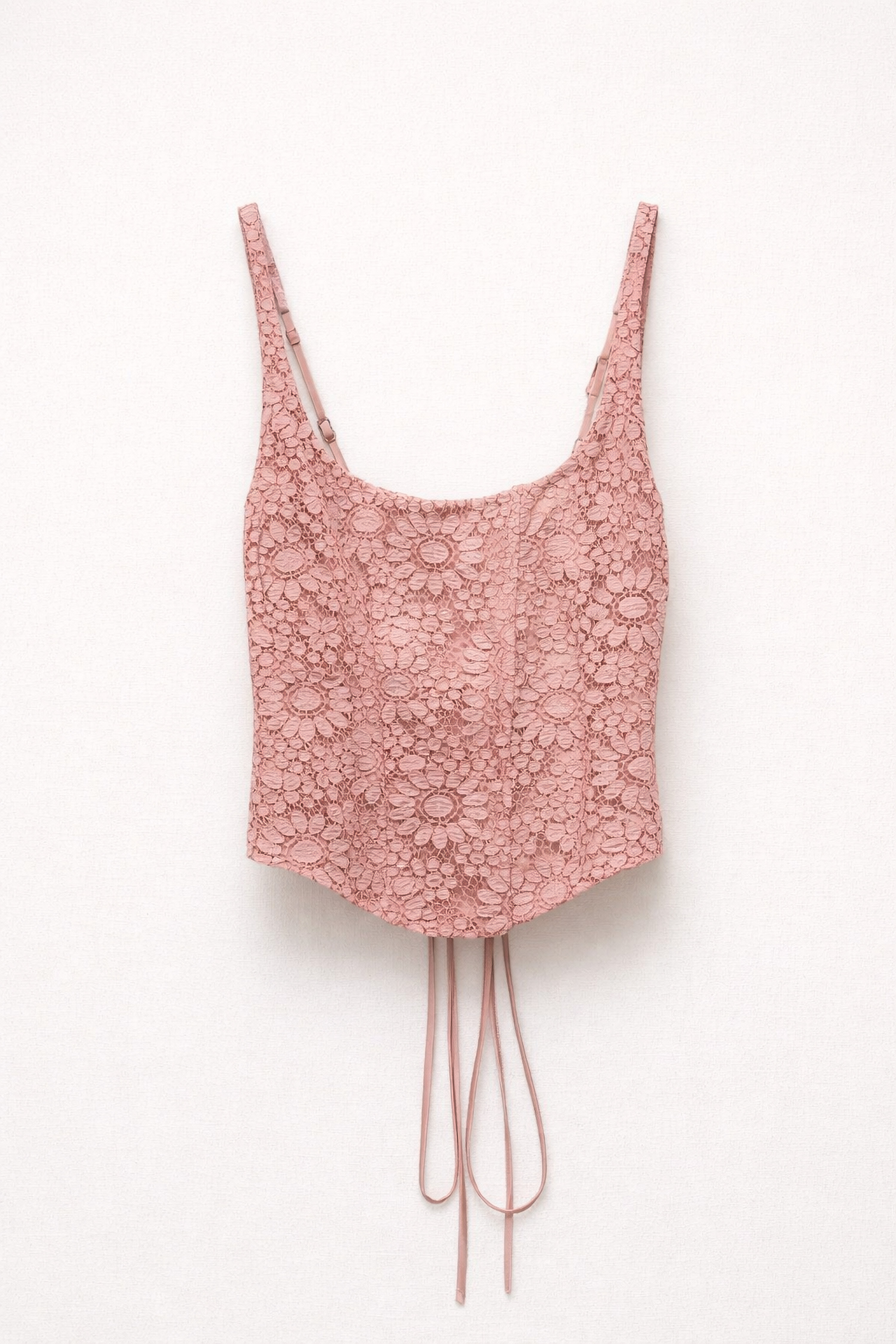 Wide neckline, wide shoulder straps, straight hem finished with lace inserts.