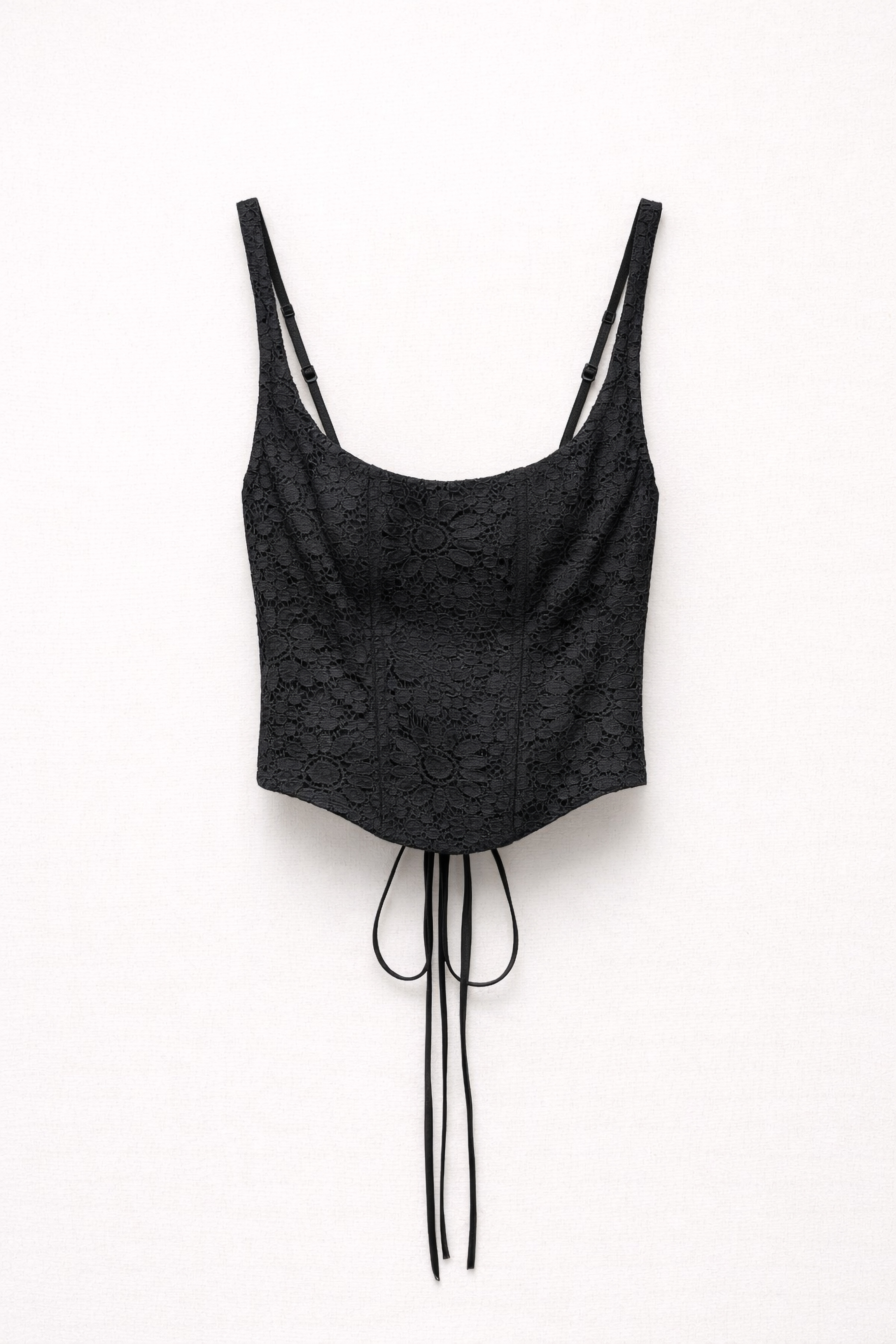 Wide neckline, wide shoulder straps, straight hem finished with lace inserts.