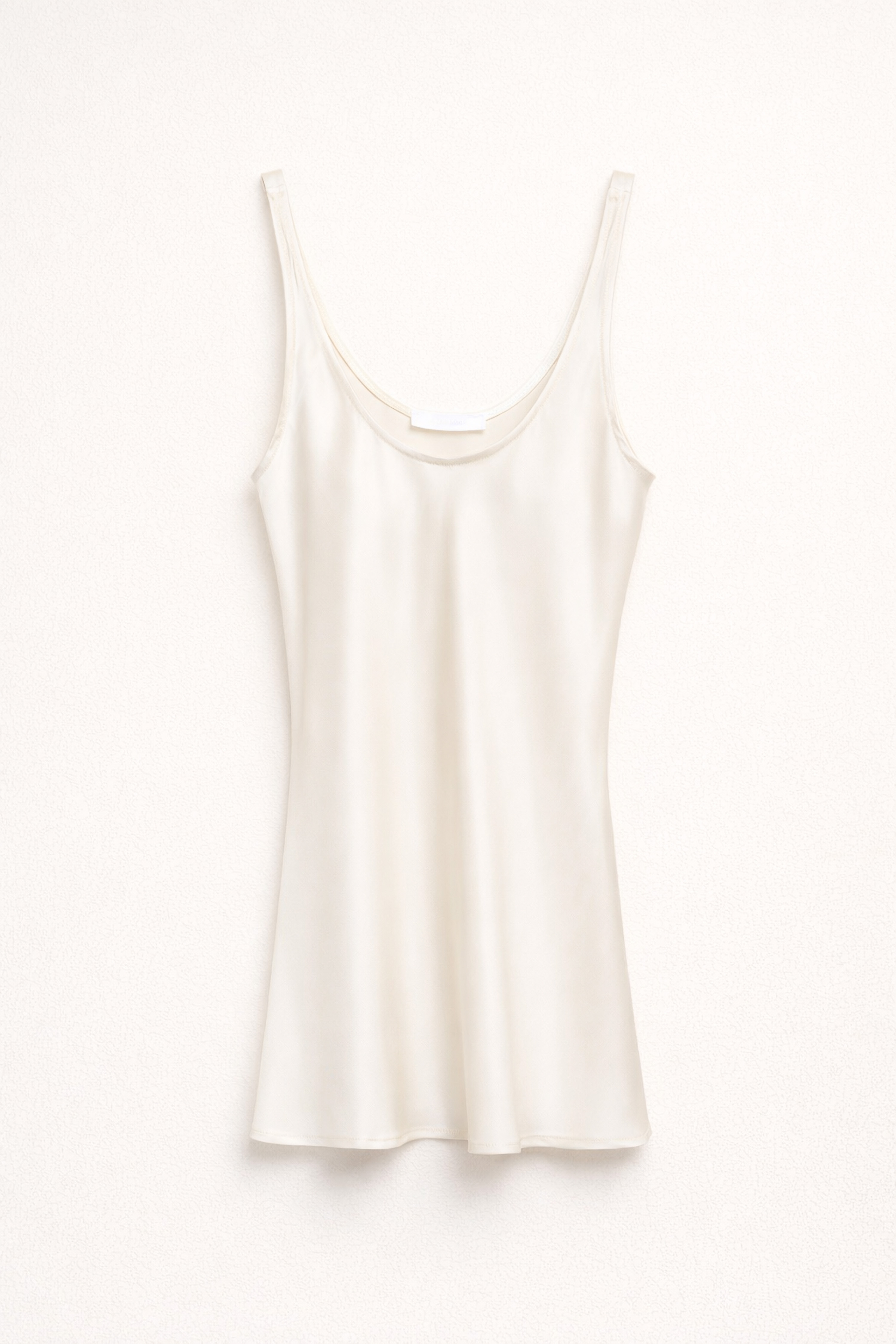 Wide neckline, wide shoulder straps, straight hem finished with lace inserts.