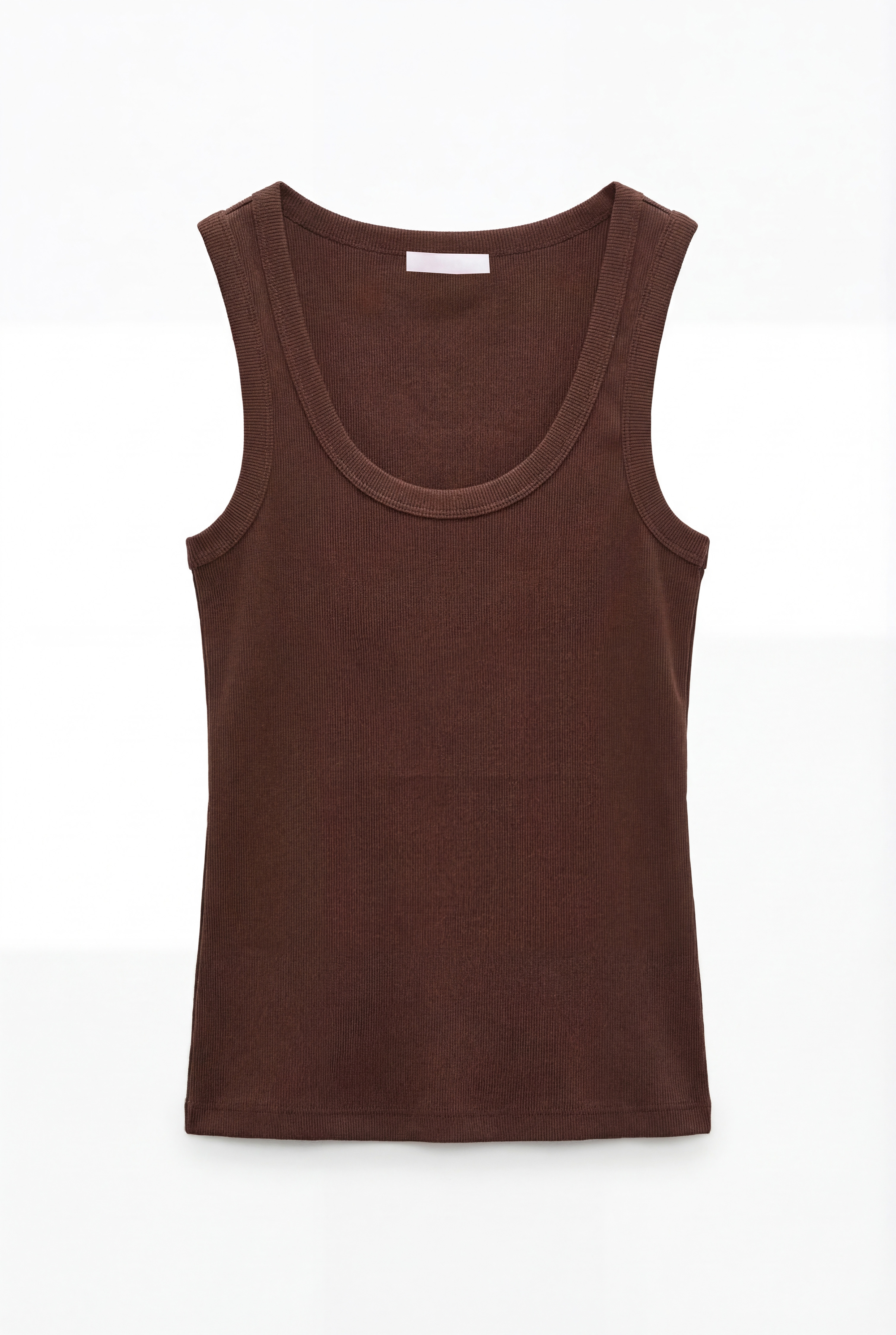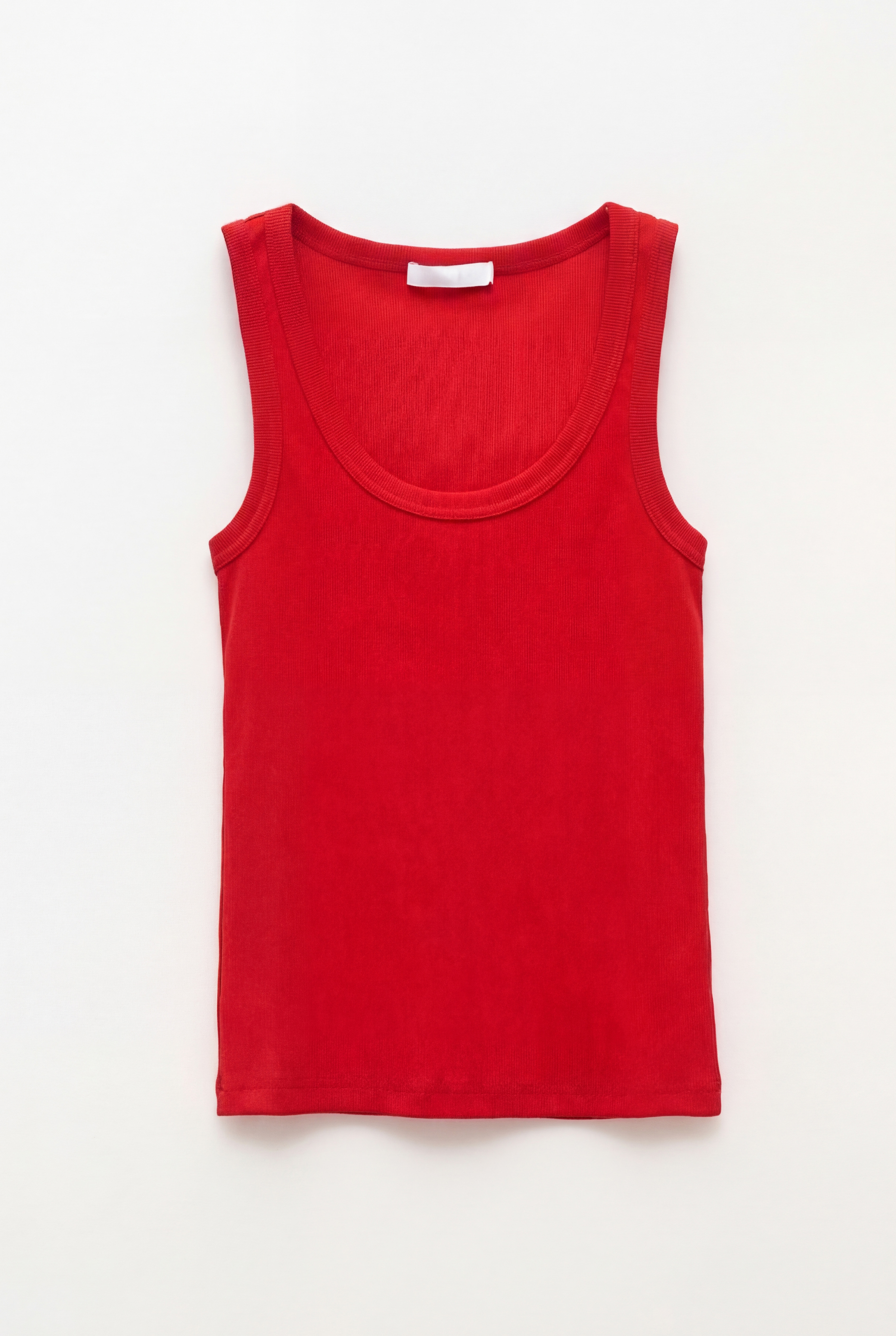 Ribbed crop tank top with wide rounded neckline.