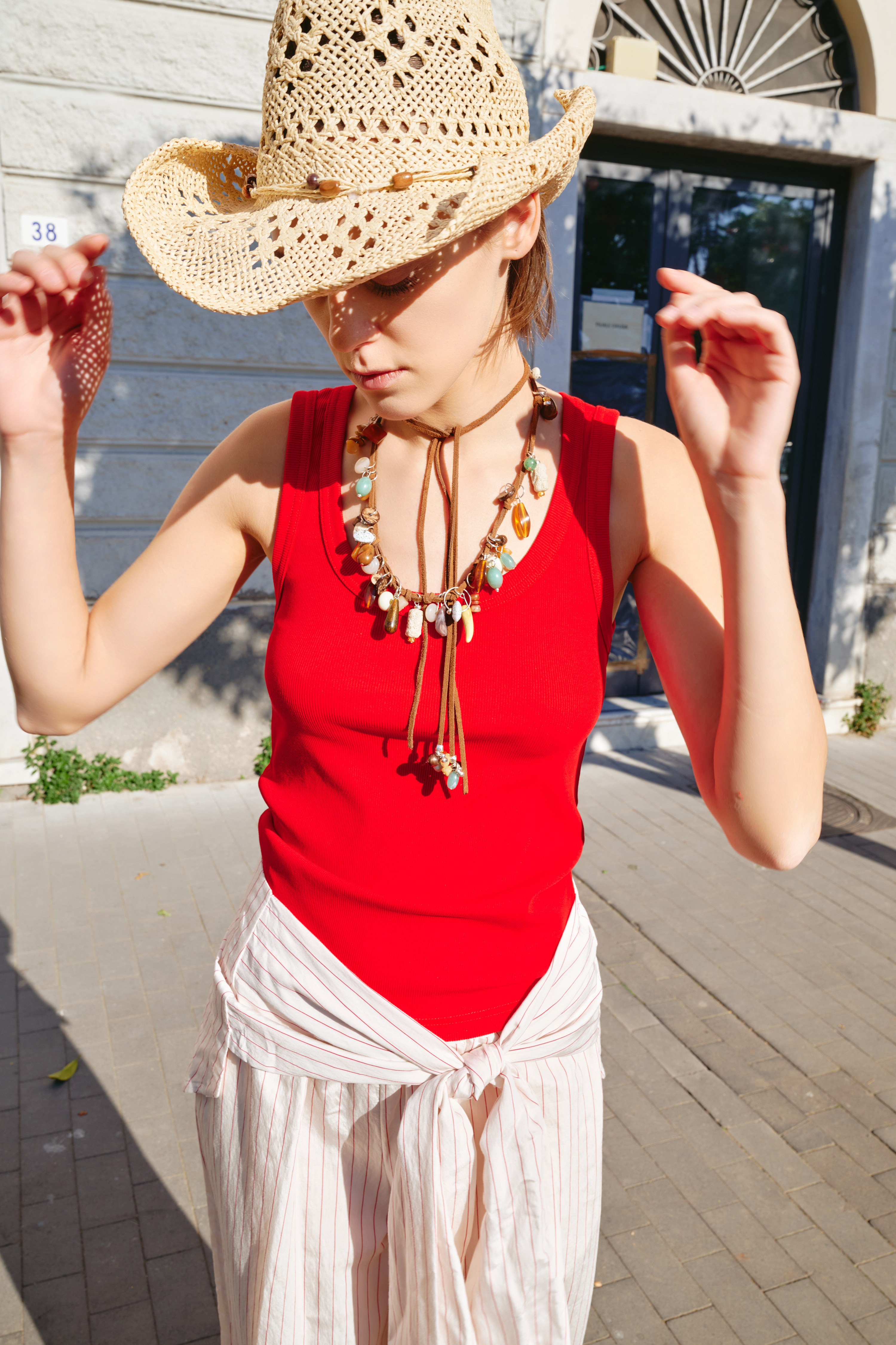 Knitted top with leather straps