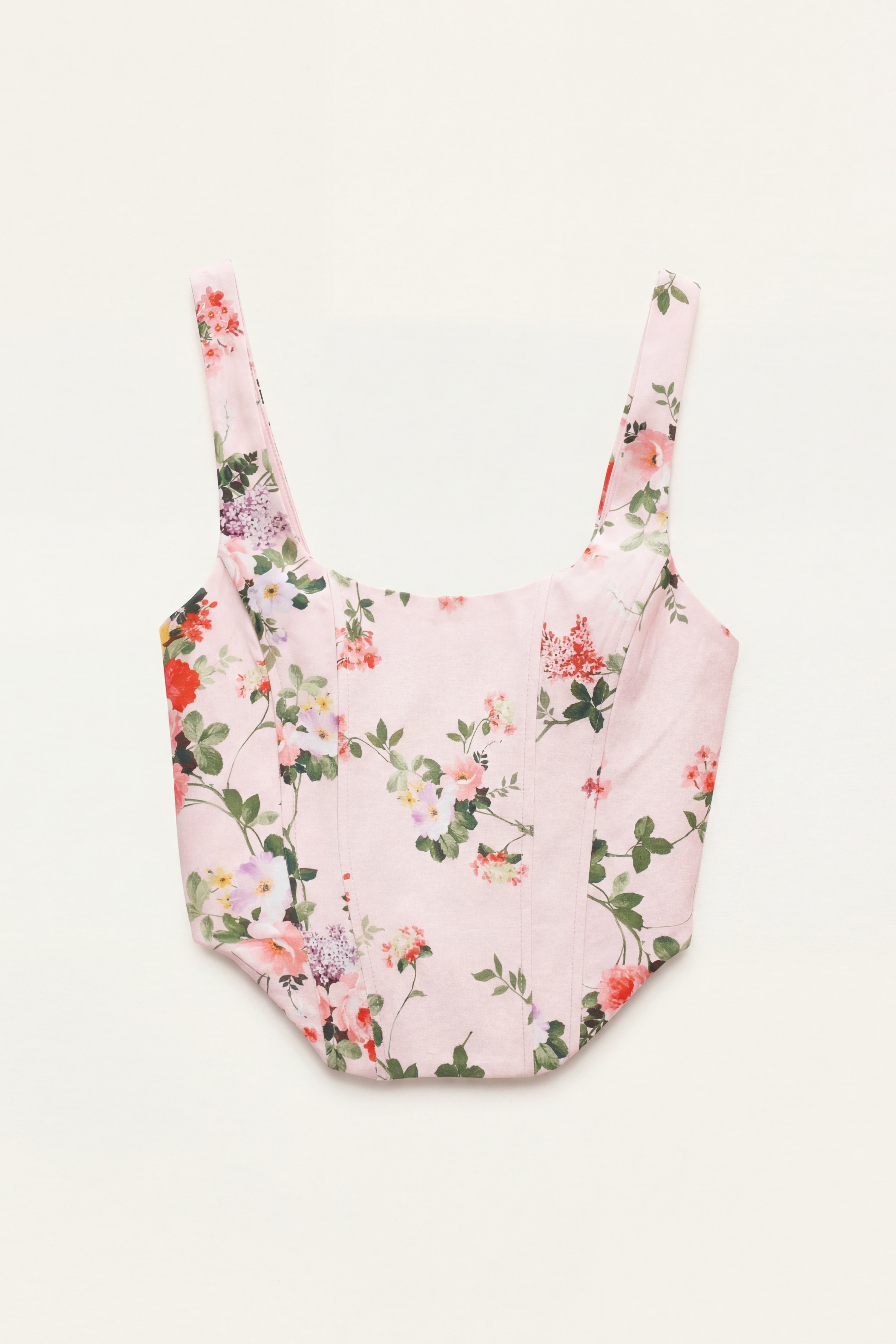 Corset top with all-over floral print.