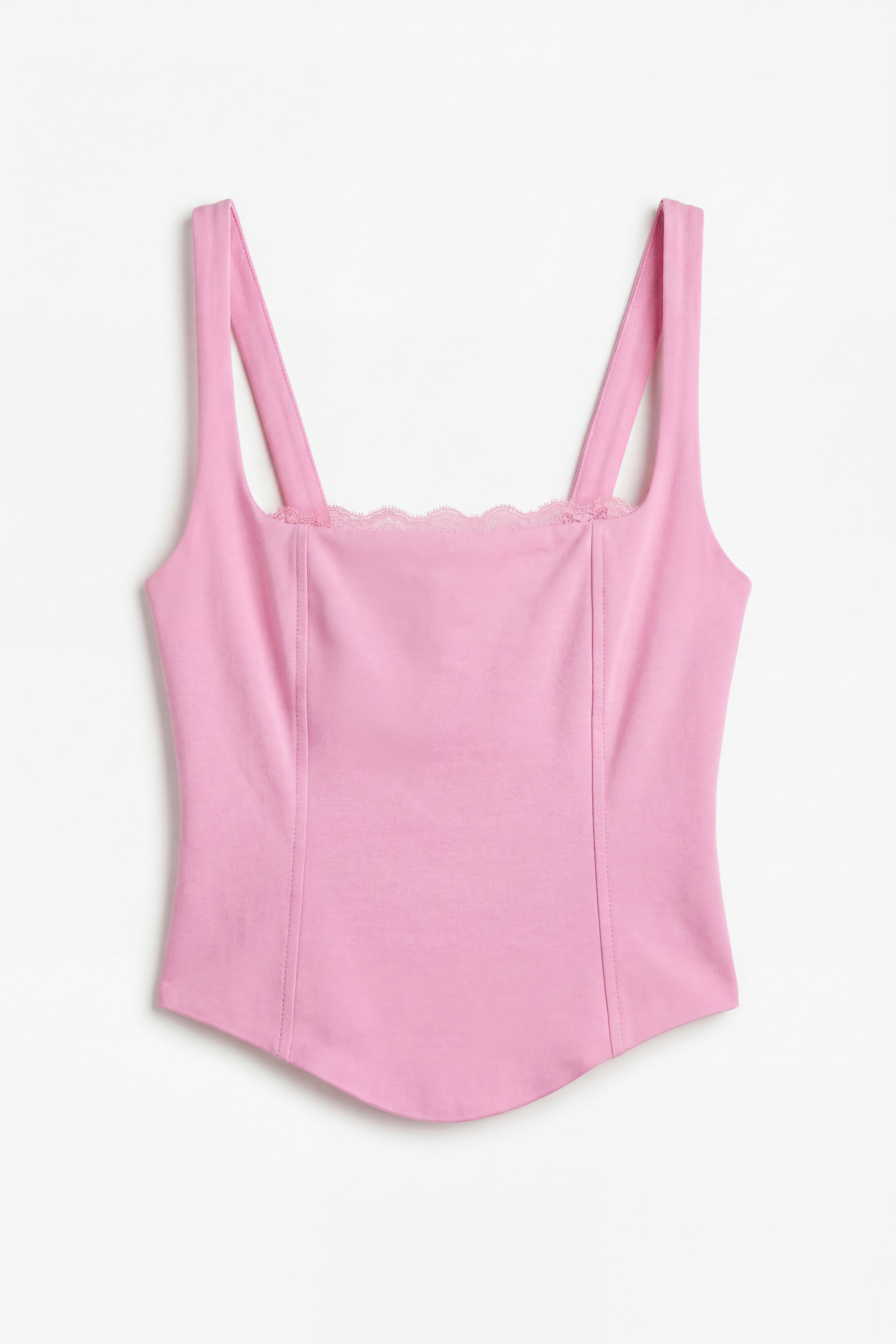 Stretch cotton crop top. Wide straight neckline. Wide shoulder straps. Decorative lace trim along the neckline. Back with gathered elasticated panel. Regular fit, available in size S/M, M/L.