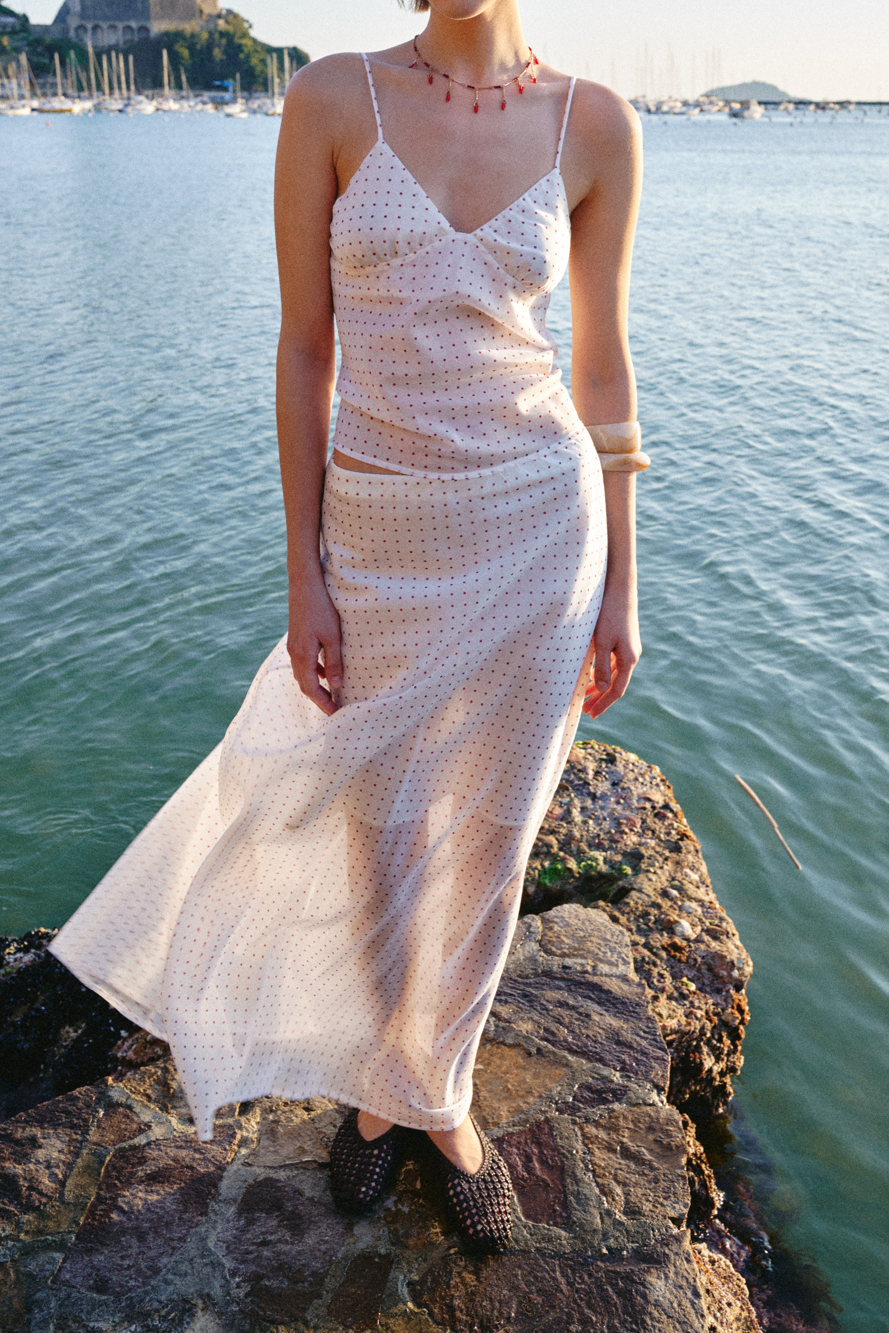 Shaped sweetheart neckline. Adjustable thin shoulder straps.