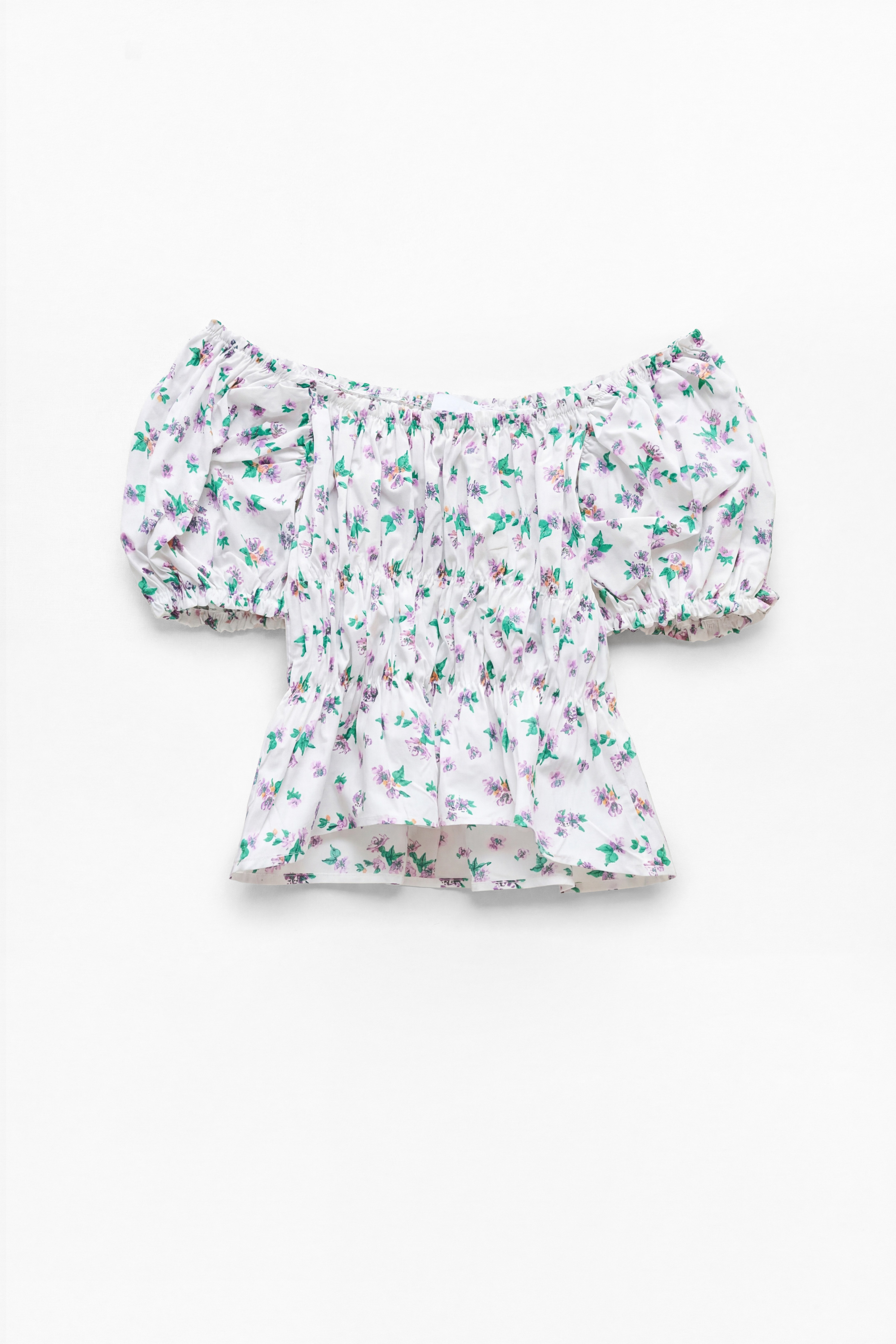 Ruffled top with all-over floral print. Short puff sleeves with elastic. Wide elasticated neckline. Slightly flared bottom with ruffles. Regular fit, available in size S/M, M/L.