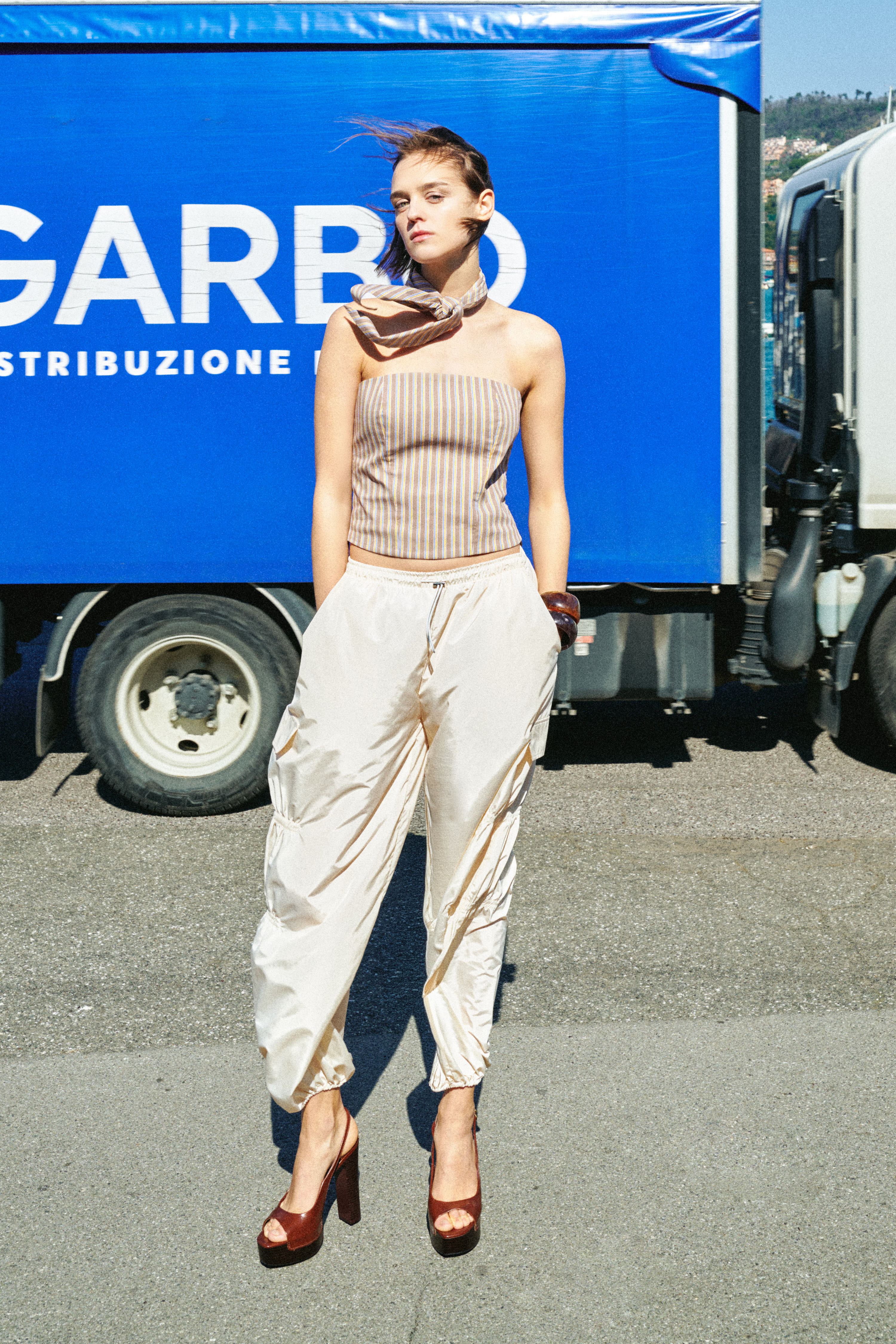 Bandeau top with vertical striped pattern.