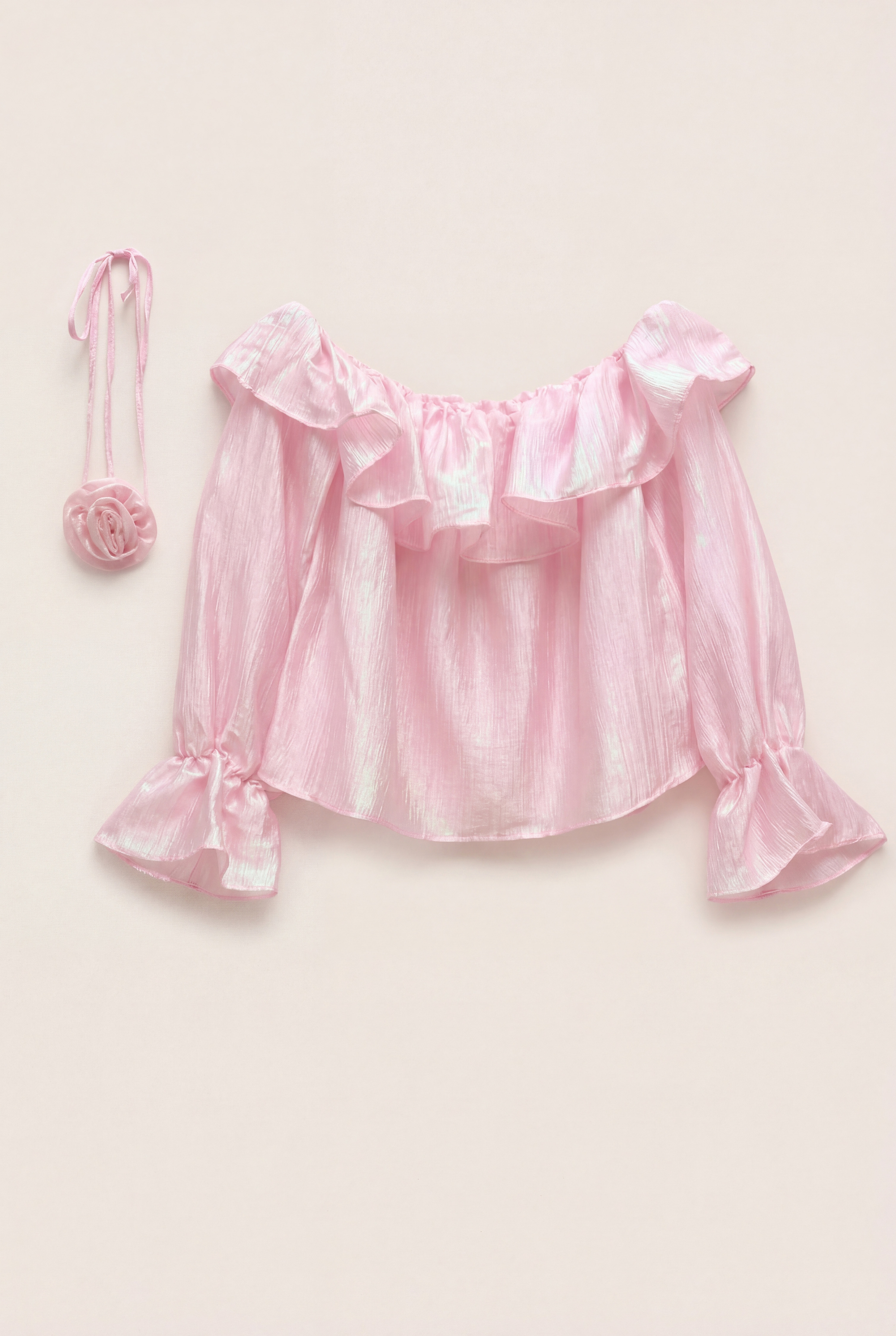 Off-the-shoulder neckline with elastic and applied ruffles.