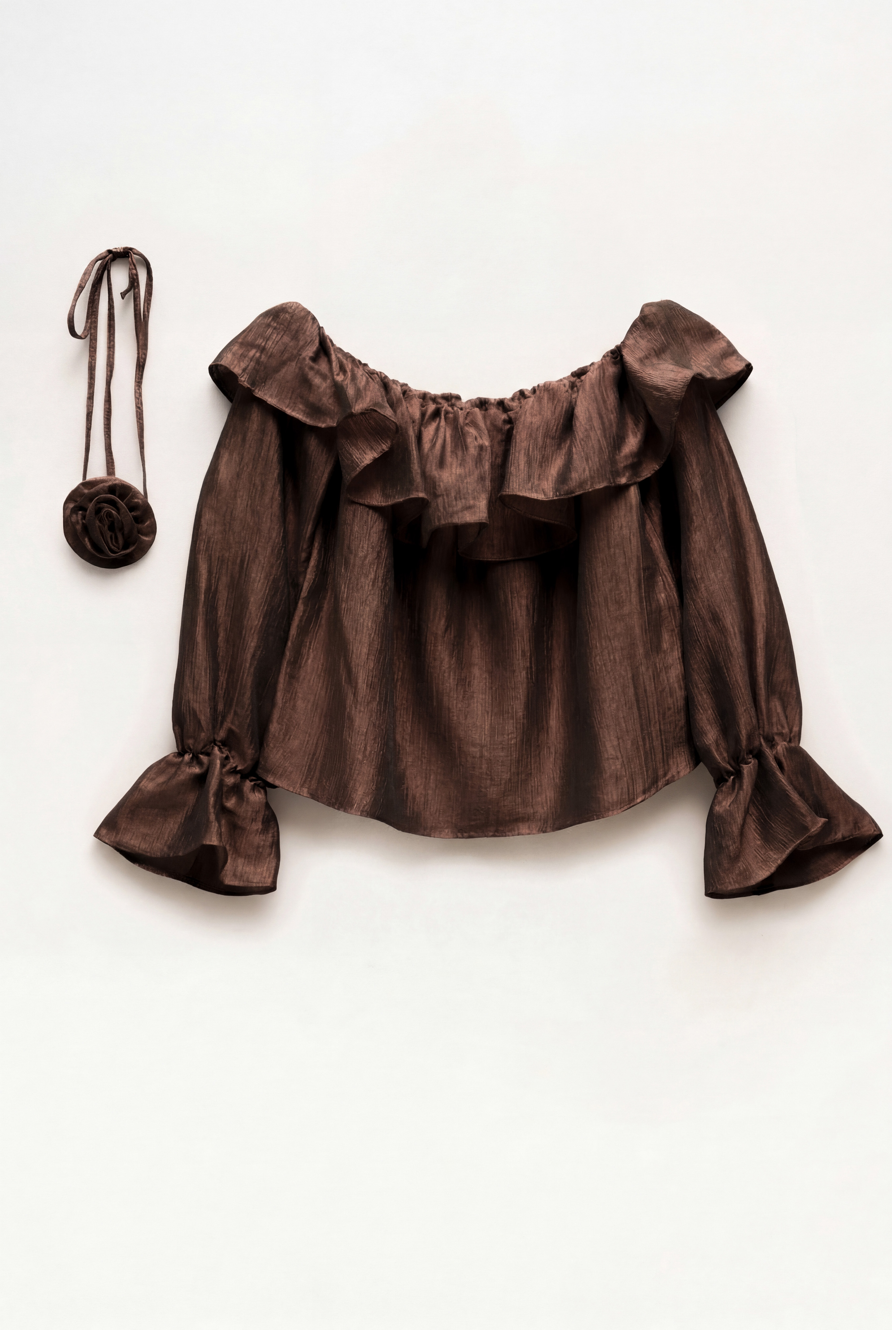 Off-the-shoulder neckline with elastic and applied ruffles.