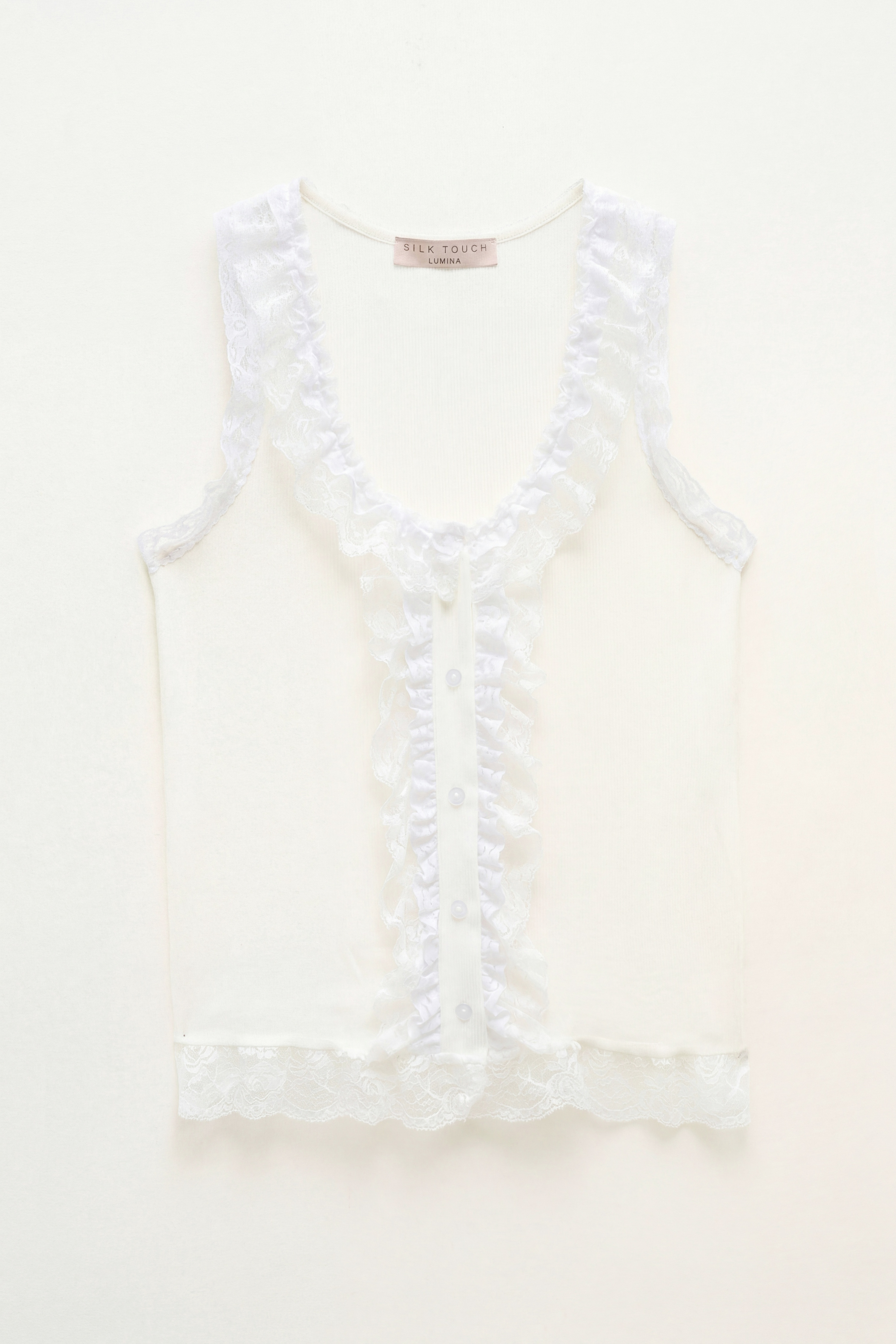 Front button closure with lace inserts on the sides.