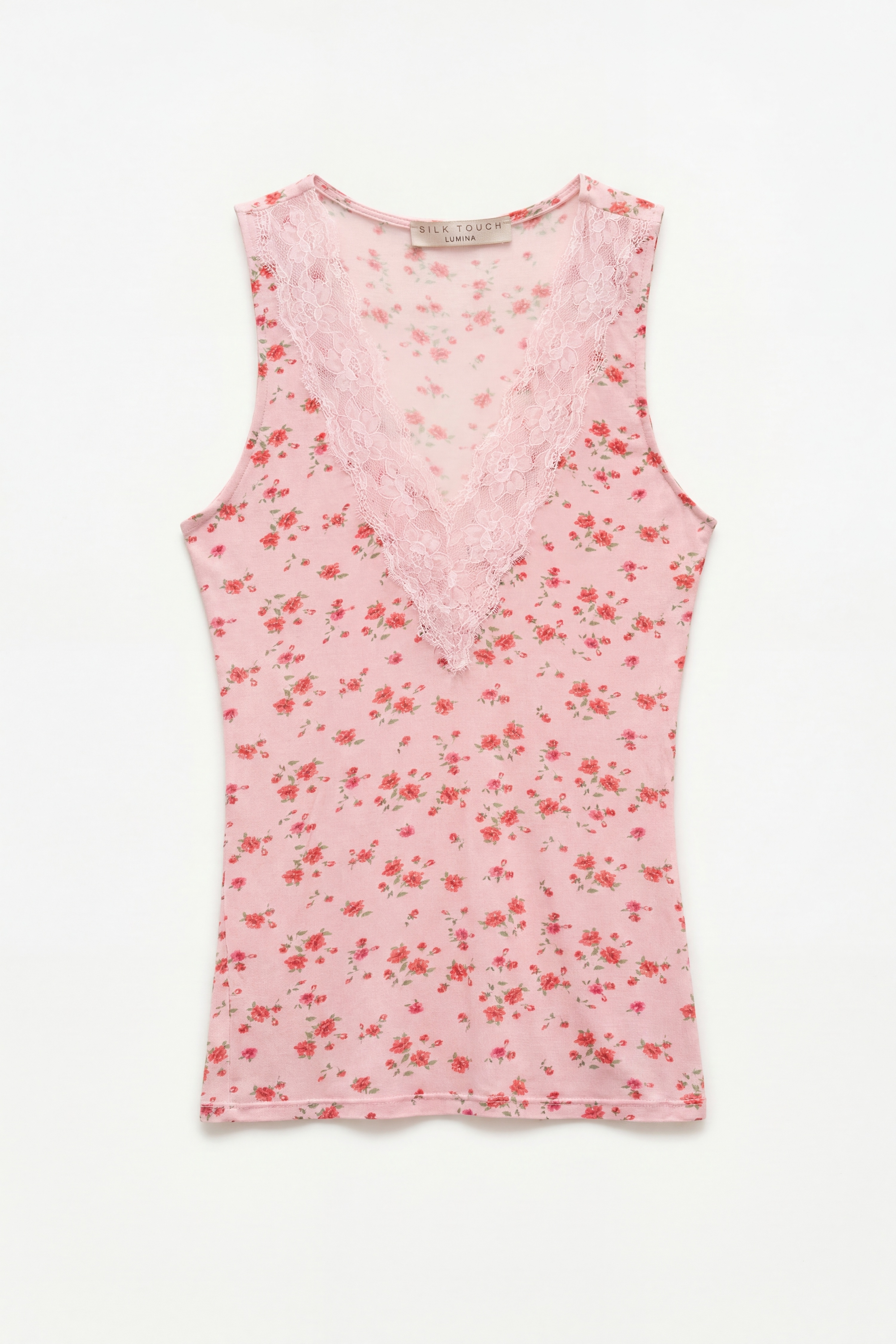 Wide neckline, wide shoulder straps, straight hem finished with lace inserts.