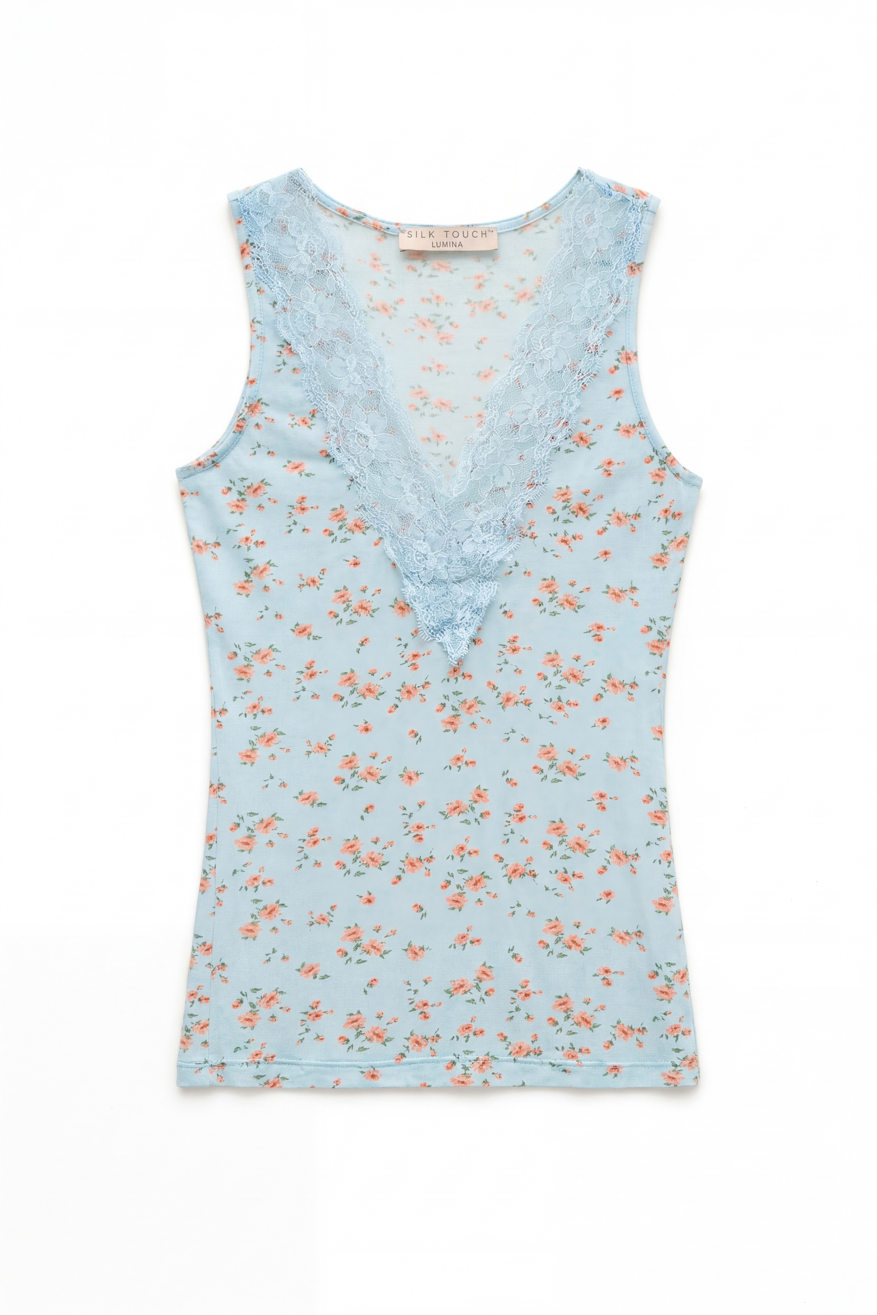 Wide neckline, wide shoulder straps, straight hem finished with lace inserts.