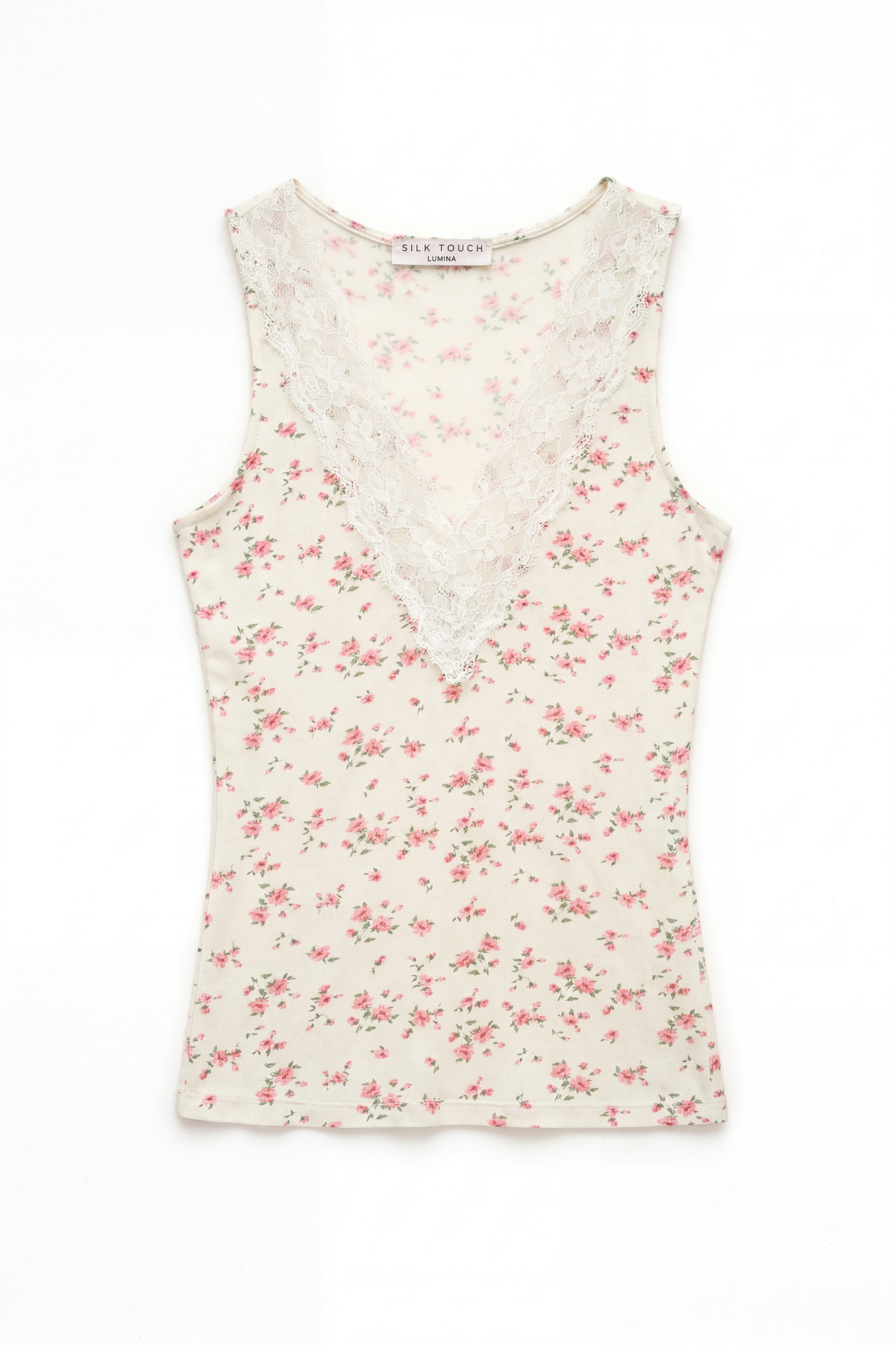 V-neck with floral lace insert.