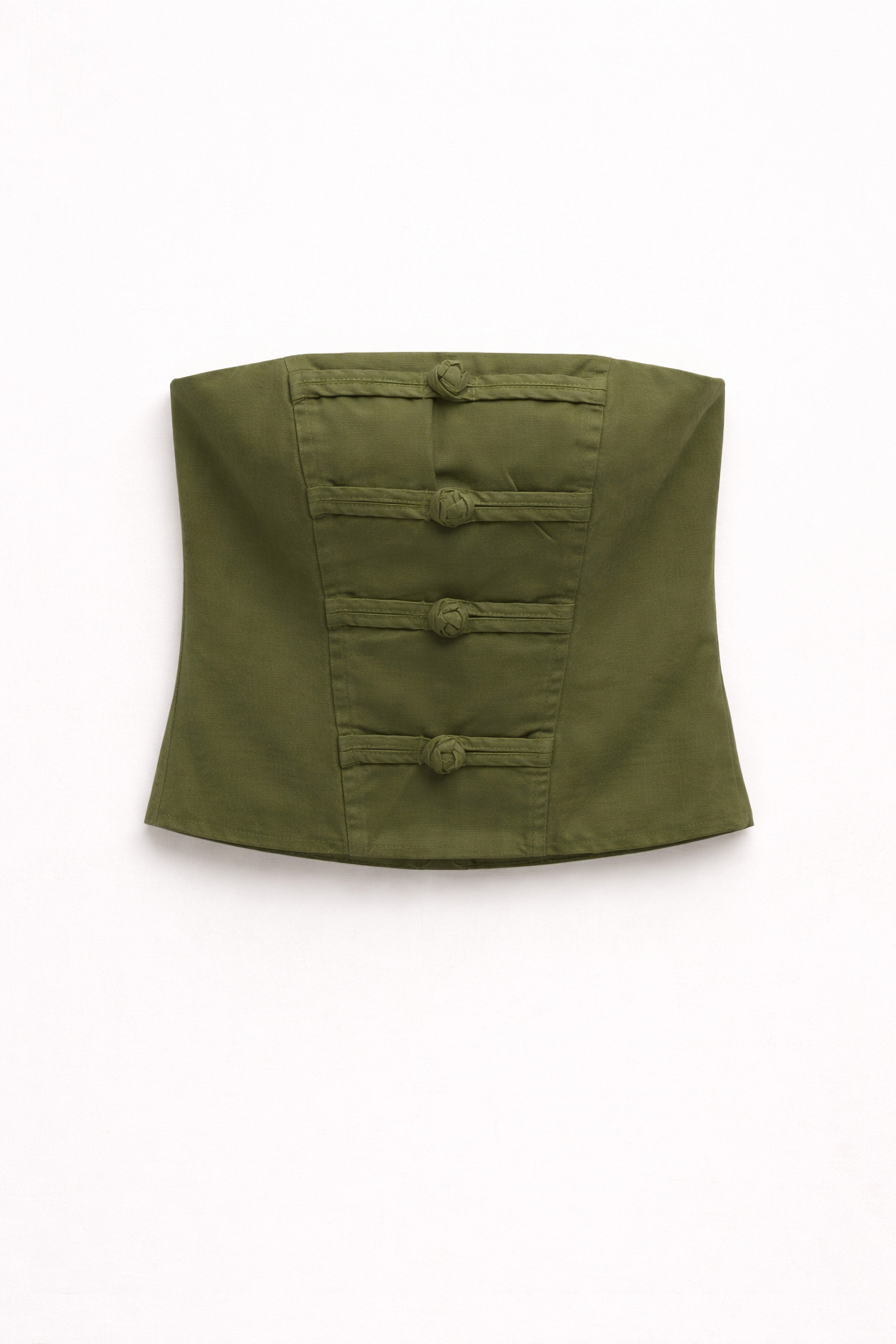 Sleeveless cargo vest with V-neck. Decorative patch pockets with flap on the chest. Cargo pockets applied to the front. Front closure with decorative knots. Regular fit, available in size S, M, L.