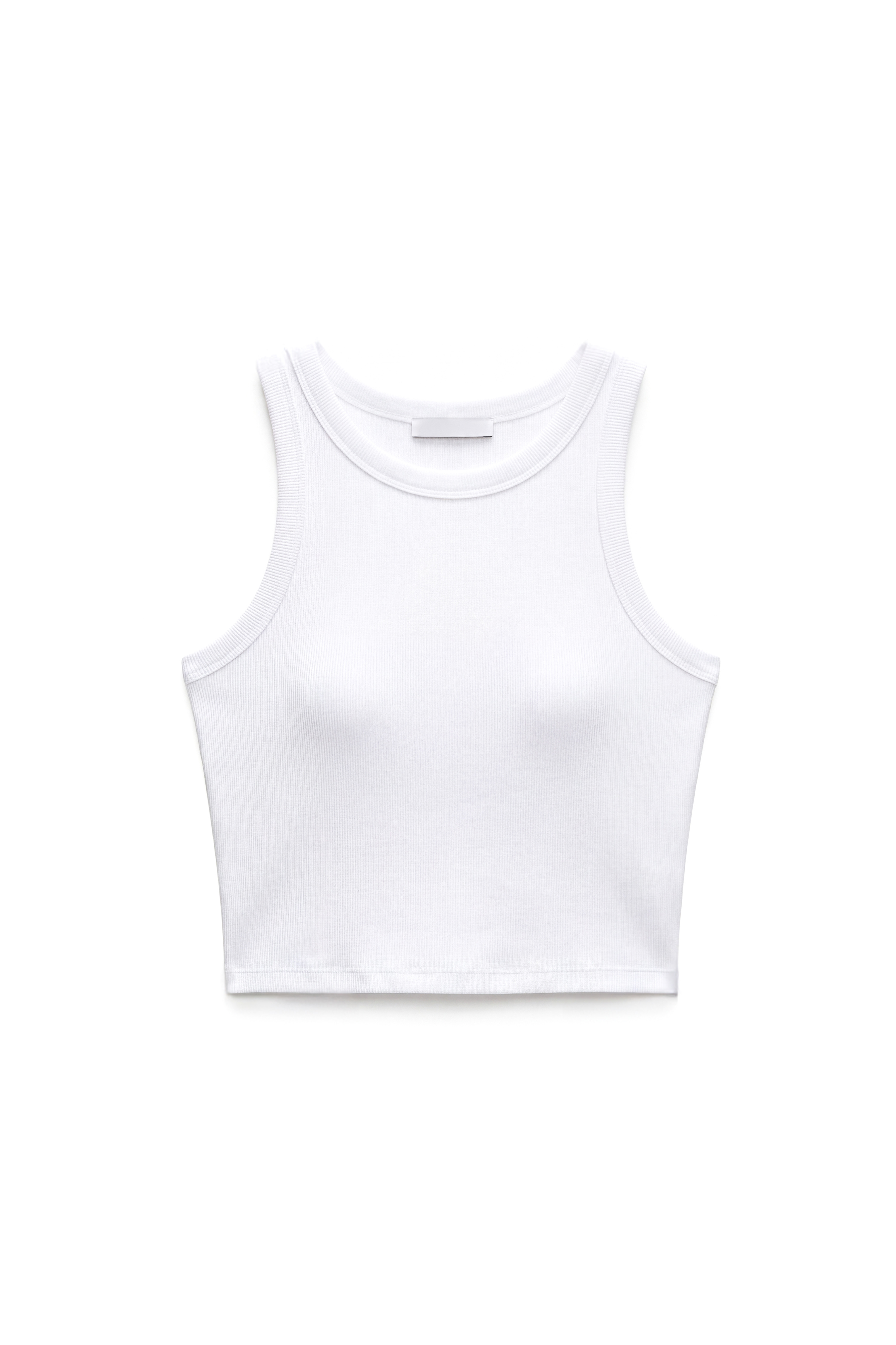 Ribbed crop tank top with wide rounded neckline.