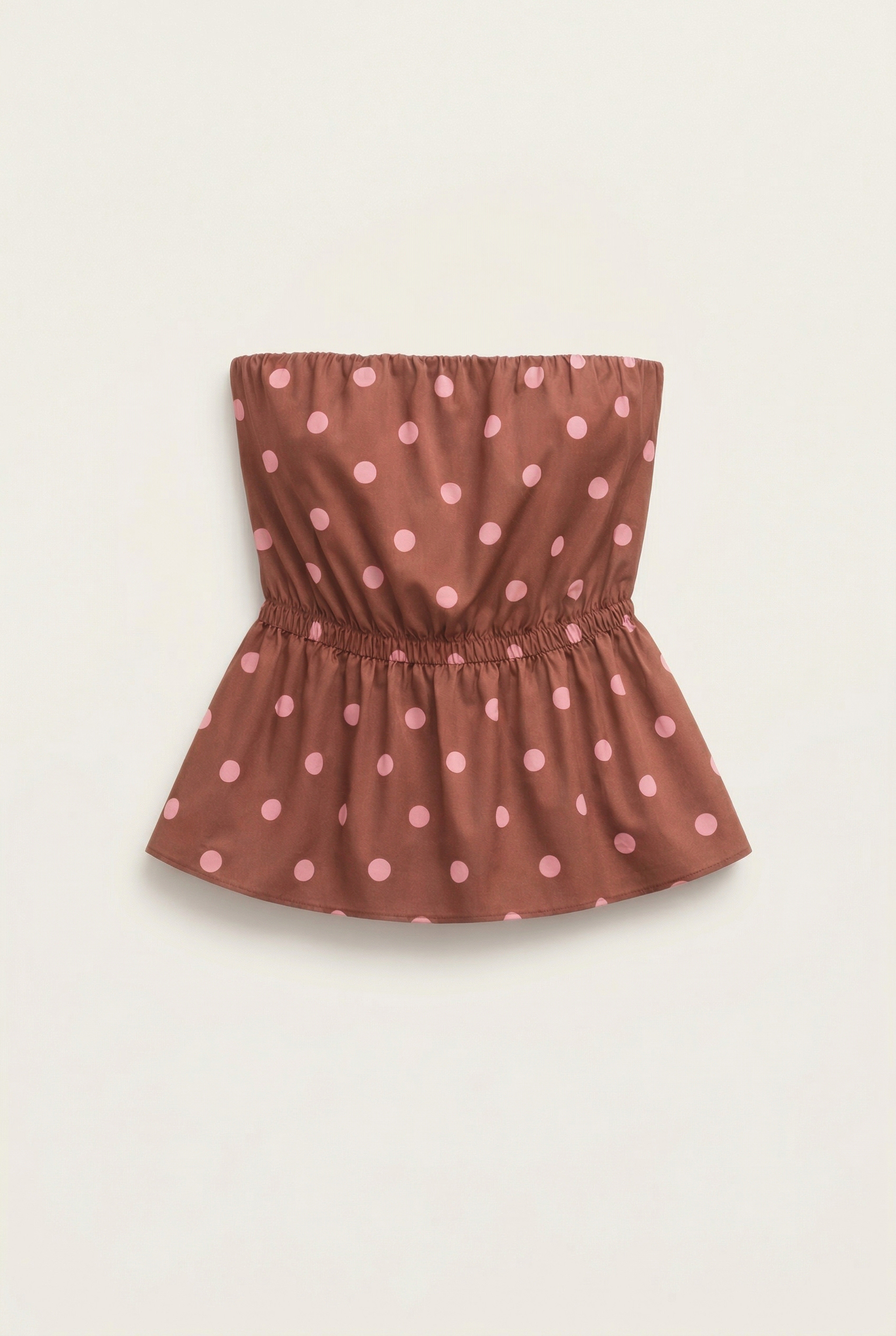Cotton blend top with polka dot print. Elasticated and gathered off-the-shoulder neckline. Ruffle at the bottom with a flared effect. Regular fit, available in size S/M, M/L.