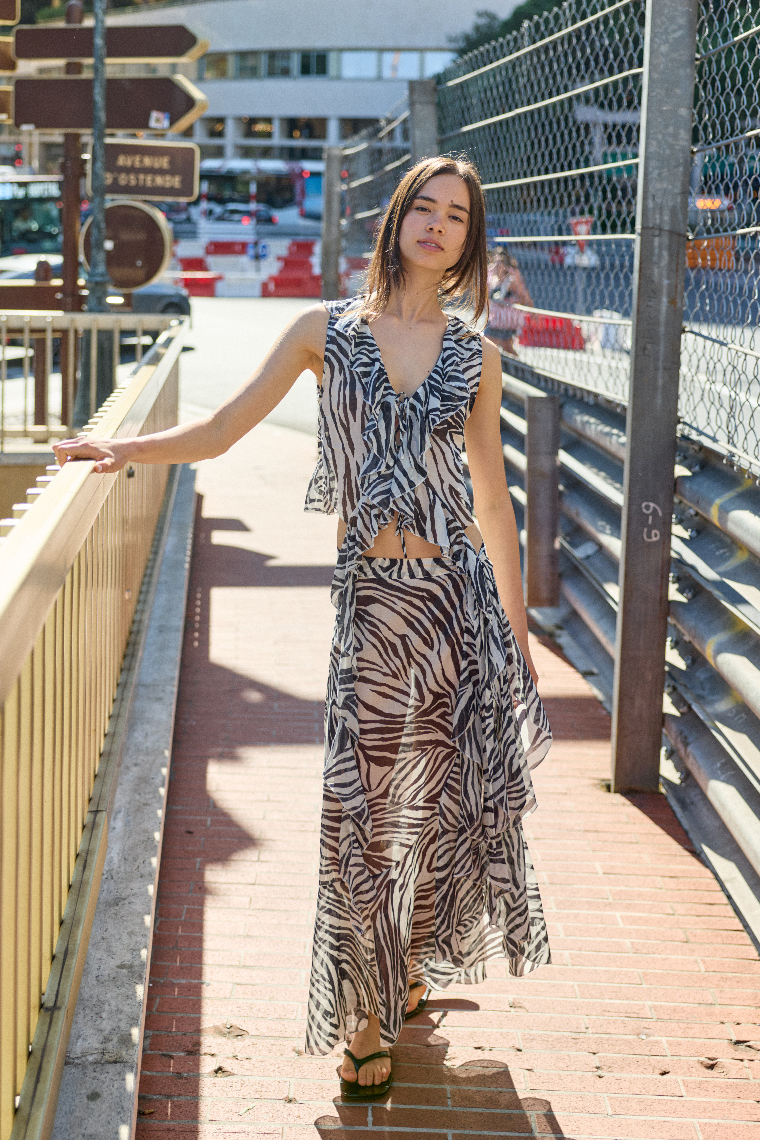 Cotton pareo skirt with zebra print. Adjustable side knot with bow. Ruffle at the bottom for a dynamic effect. Regular fit, available in size S/M, M/L.