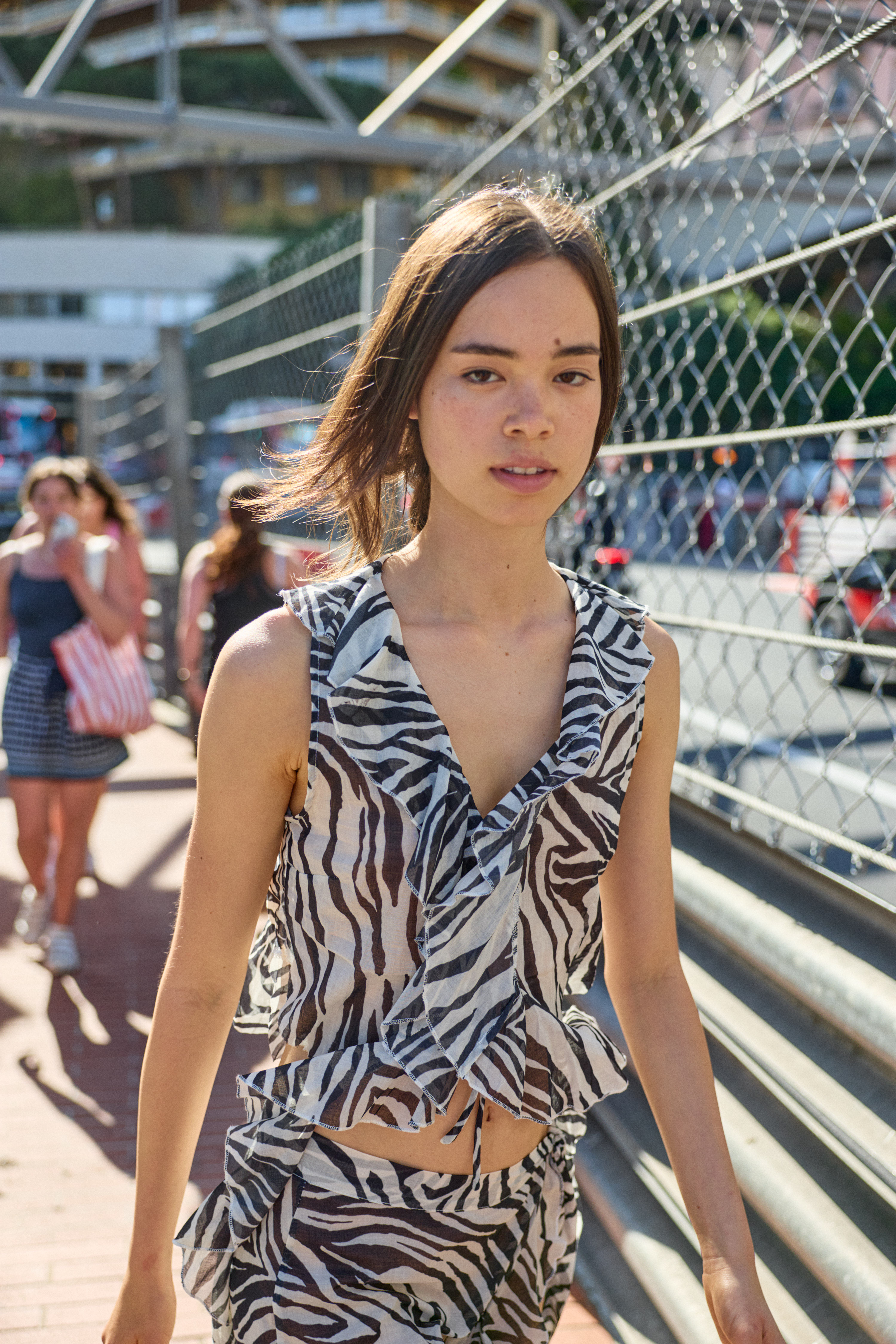 Ruffled top with all-over zebra print. V-neck with adjustable front opening. Ruffles applied across the entire front and back. Asymmetrical hem with ruffled insert. Closure with thin adjustable laces. Regular fit, available in size S, M, L.