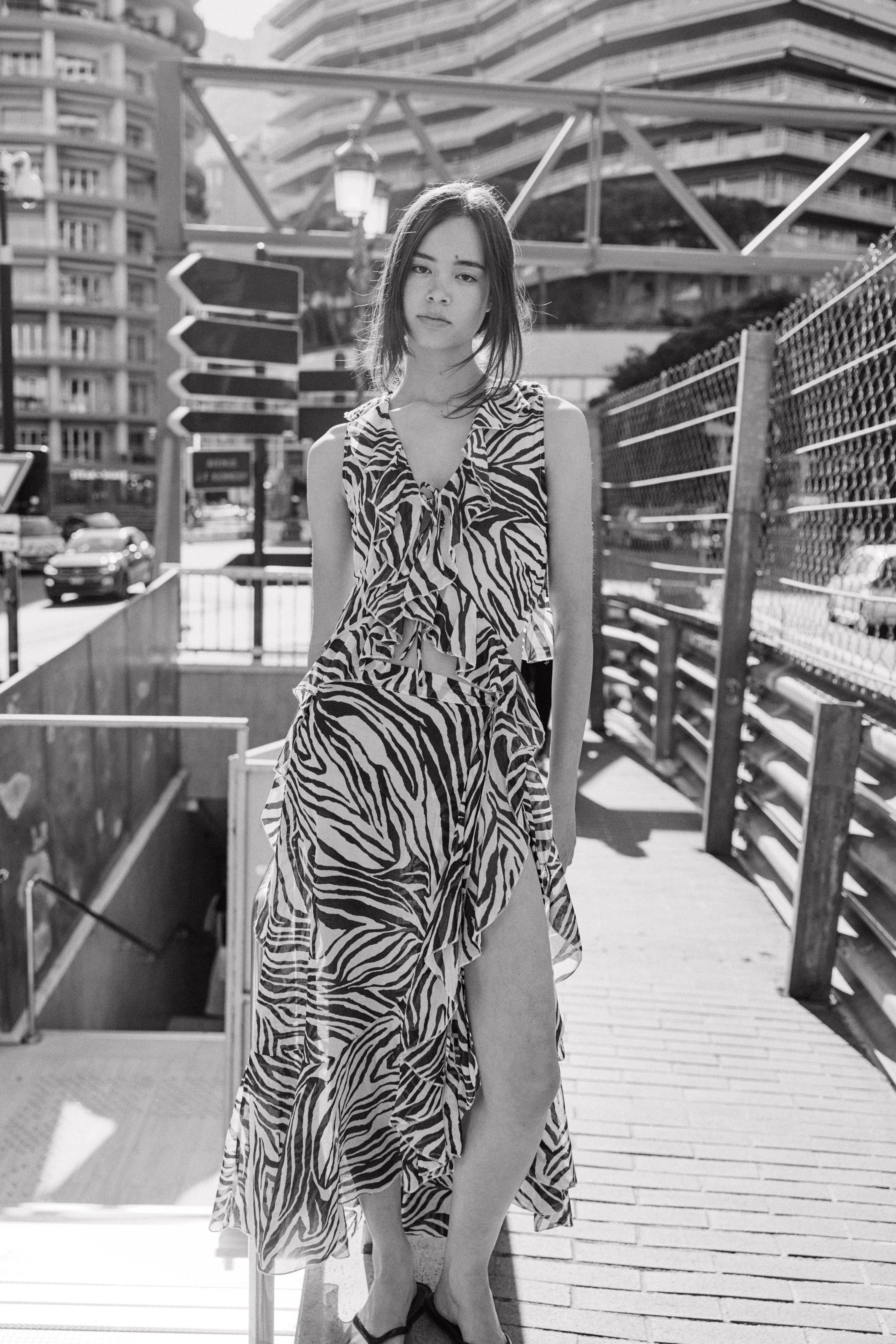 Long dress with all-over zebra print. Deep V-neck at the front. Wide kimono-style sleeves, short and flowing. Drawstring waist with laces and decorative tassels. Long, soft skirt with side slits. Regular fit, available in ONE size.