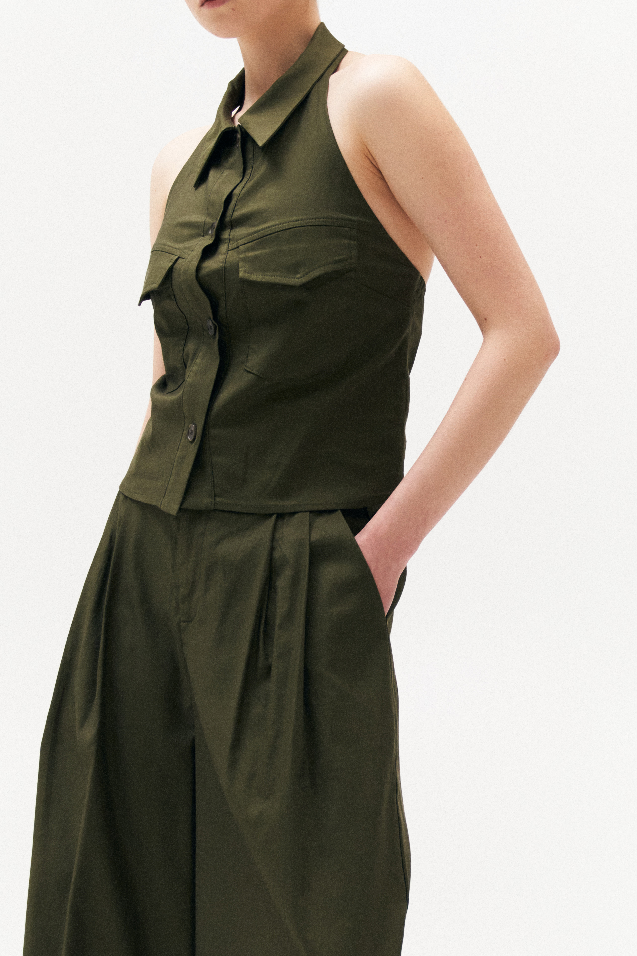 Linen blend vest with halter neck. Front patch pockets with flap. Open back with elasticated insert. Front button closure. Regular fit, available in size S, M, L.